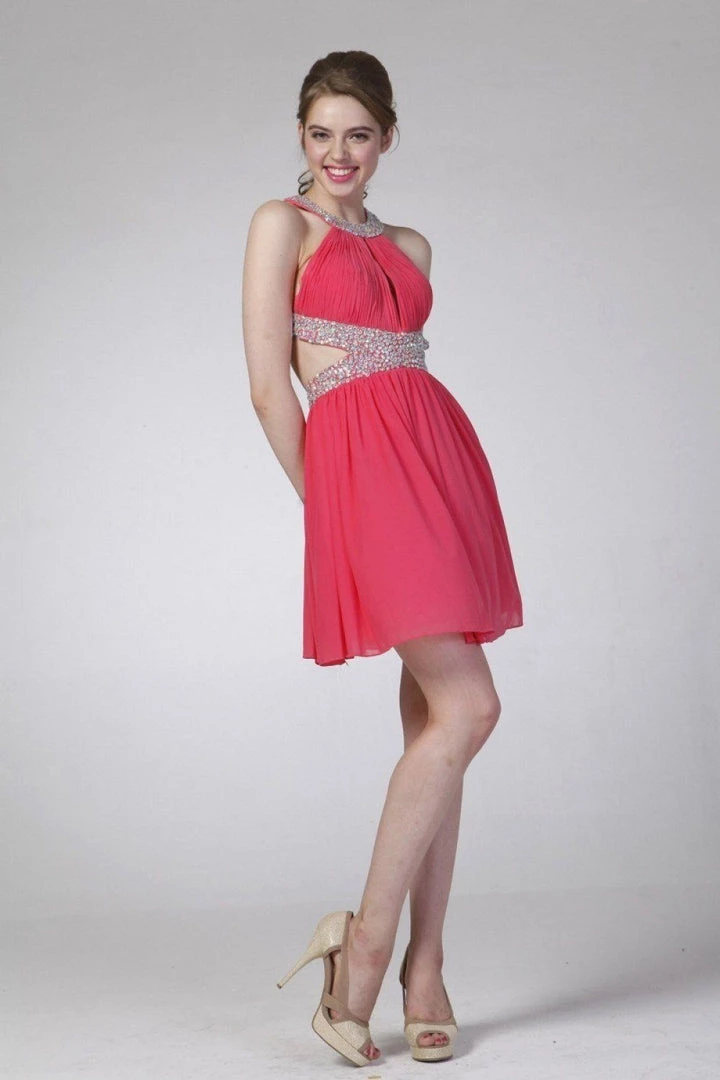 - A-line stretch net short dress with keyhole halter neckline and beaded details