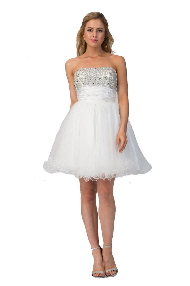Turn heads in this jeweled strapless cocktail dress with ruffled skirt by Star Box 5116. This beautiful short dress features a straight across strapless bodice embellished with jeweled rhinestones, ruched satin sash helps define the empire waist, poofy short ruffled skirt with a curly hemline, and a zipper closure. Affordably priced at $159, this short party dress is perfect for any formal event and will keep you on budget!