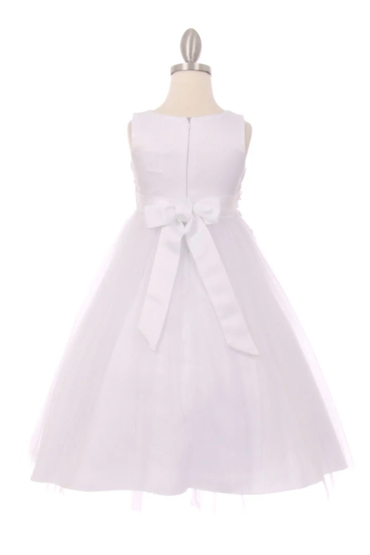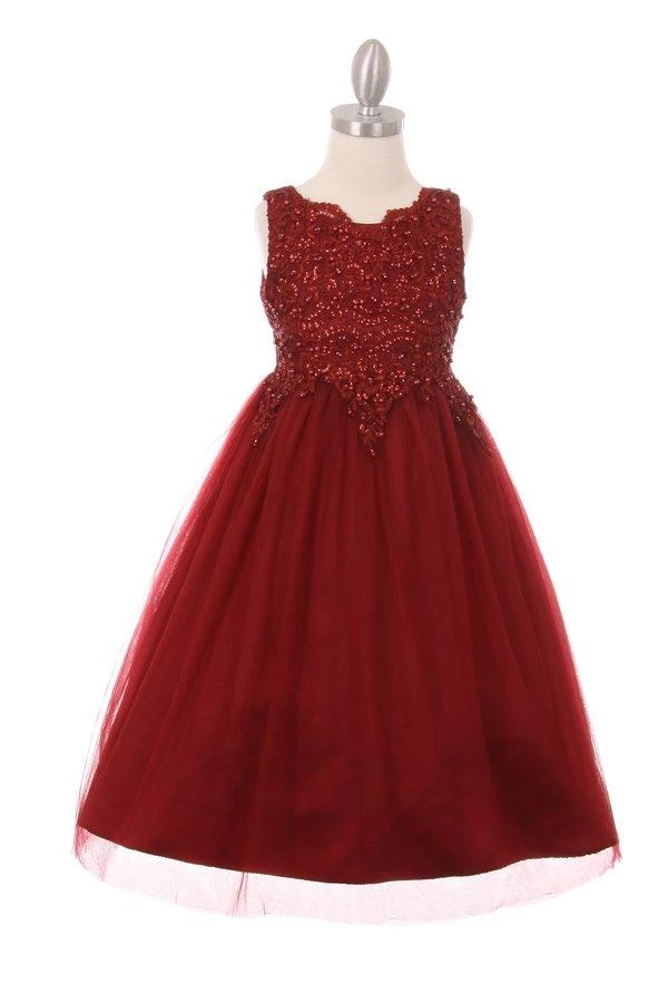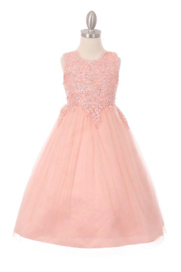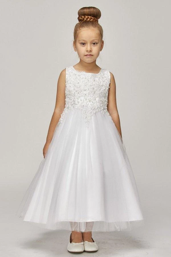 Your sweet girl will look picture-perfect in this sleeveless tea length tulle dress with sequined lace applique bodice by Cinderella Couture 5008. Super elegant tulle dress features a sleeveless bodice decorated with lace appliques accented with pearl sequins, back satin tie for a better fit, A-line tulle skirt with full hard net lining, and an invisible back zipper.