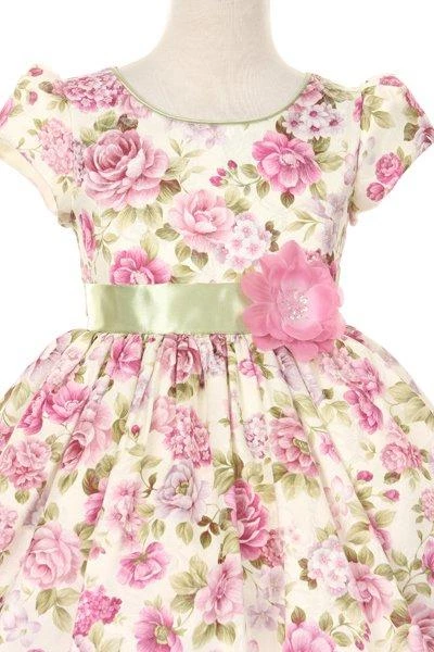 Your sweet girl will look picture-perfect in this tea length floral print dress with short sleeves by Cinderella Couture ME731. Flower print jacquard dress beautifully trimmed with elegant sage satin, with sequence flower. Oodles of blooms enliven every inch of this adorable floral selection, from the charming hues to the satiny rosette sash. A handy back closure adds convenience.