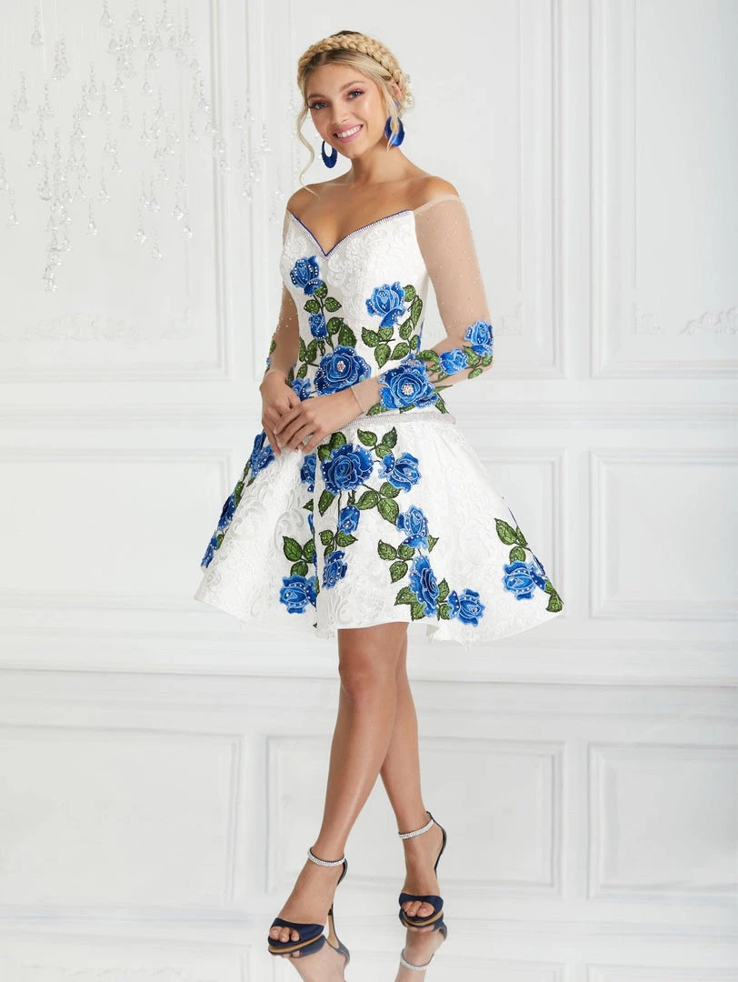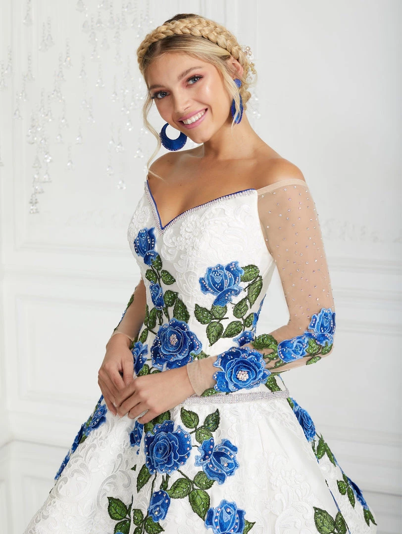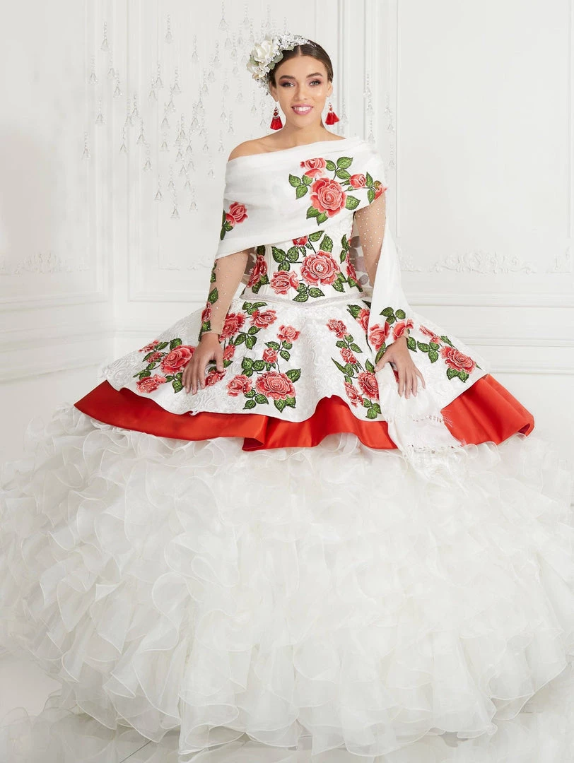 All eyes will be on you in this 3 piece rose embroidered charro ball gown with A-line ruffled skirt by House of Wu LA Glitter 24075. Made out of satin and organza, this beautiful ball gown features a V-neck off the shoulder bodice adorned with a bouquet of contrasting rose embroidery, sheer long sleeves, partial open back, and a floor length skirt with organza ruffles. This look is finished with a lace-up corset back. We love this three-piece gown because it includes a detachable organza ruffle skirt – giving you a stunning and versatile second look with a short dress underneath! The matching shawl is included.