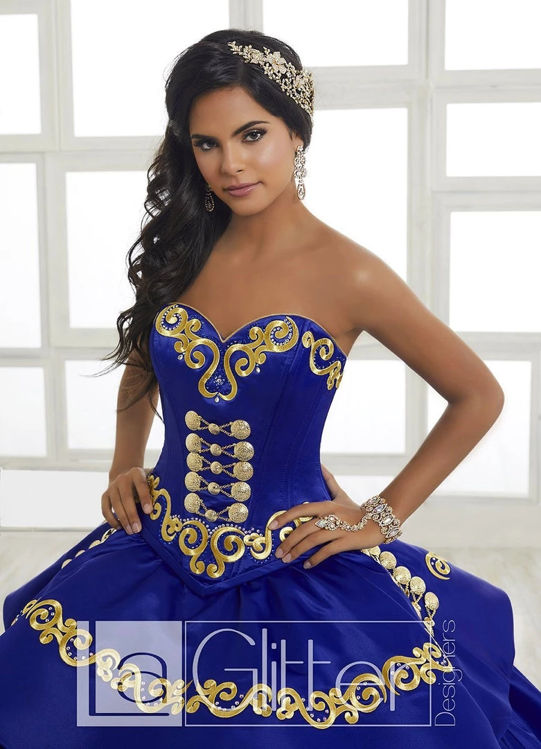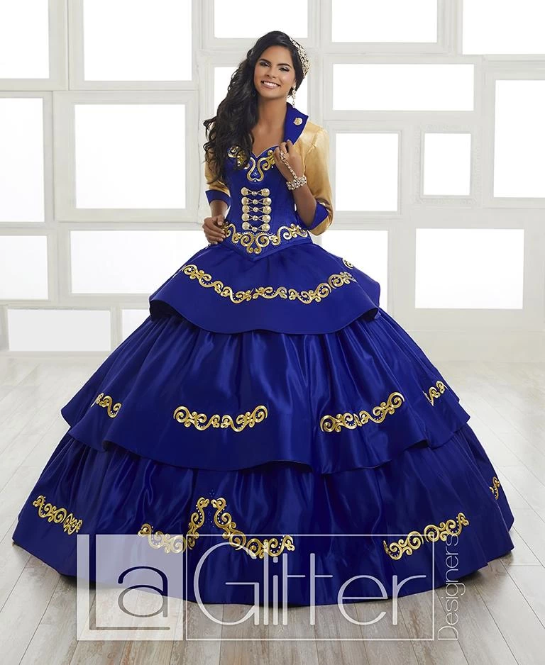 Look stunning in this 3-piece long Charro dress with A-line tiered skirt by House of Wu LA Glitter 24022. Wear your best with this ball gown. A three-piece style that comes with a 3/4 sleeve jacket. Introduces a two-tier, silky satin skirt with shiny embroidery and beads. Under the hem of each tier is a wide strip of horsehair edging. The bodice and bolero are decorated with gold coins and medallions. For the rest of your big night, enjoy the matching mini-skirt that comes with this dress.