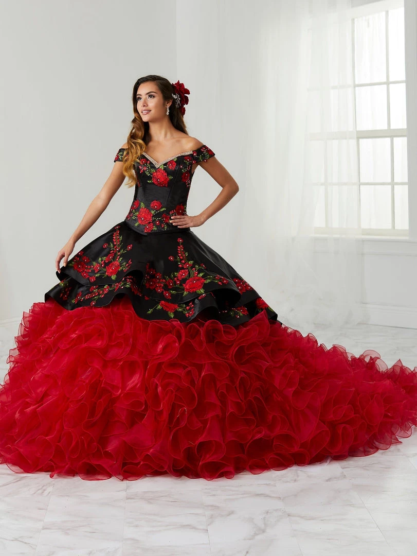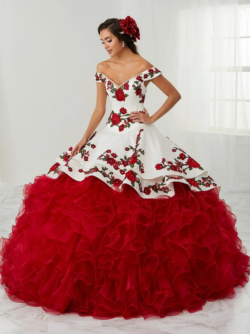 Look breathtaking in this floral charro ball gown with A-line ruffled skirt by House of Wu LA Glitter 24081. Make a bold statement in this gorgeous off the shoulder ball gown. The bodice is accented with corset boning and beautifully decorated with embroidered and beaded flowers. This three-piece dress features a multi-tier ruffle organza skirt with a detachable tail and ends with a corset back.