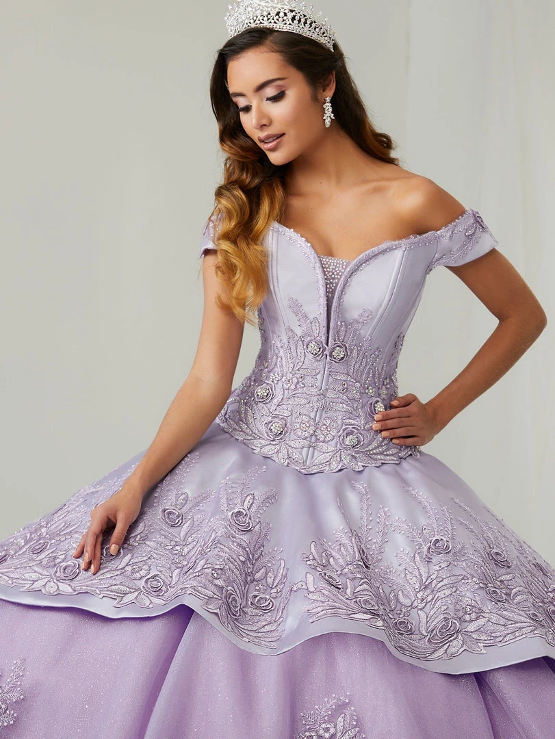Make lasting memories in this floral applique off the shoulder ball gown with A-line skirt by House of Wu LA Glitter 24083. Have a magical moment in this gorgeous off the shoulder sweetheart neckline ball gown. The bodice is accented with exposed boning and 3-dimensional flowers, that continue on the overskirt of the gown. Glitter tulle adds drama to the skirt. This look is finished with a corset back.