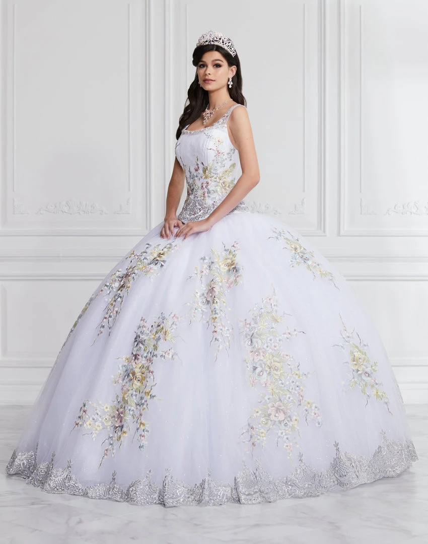 Make a grand entrance in this floral embroidered ball gown with removable by House of Wu LA Glitter 24067. Multi color floral lace applique decorates this glitter tulle long-line corset bodice which features detachable embellished shoulder straps, lace up back detail, and lace hem glitter tulle skirt.