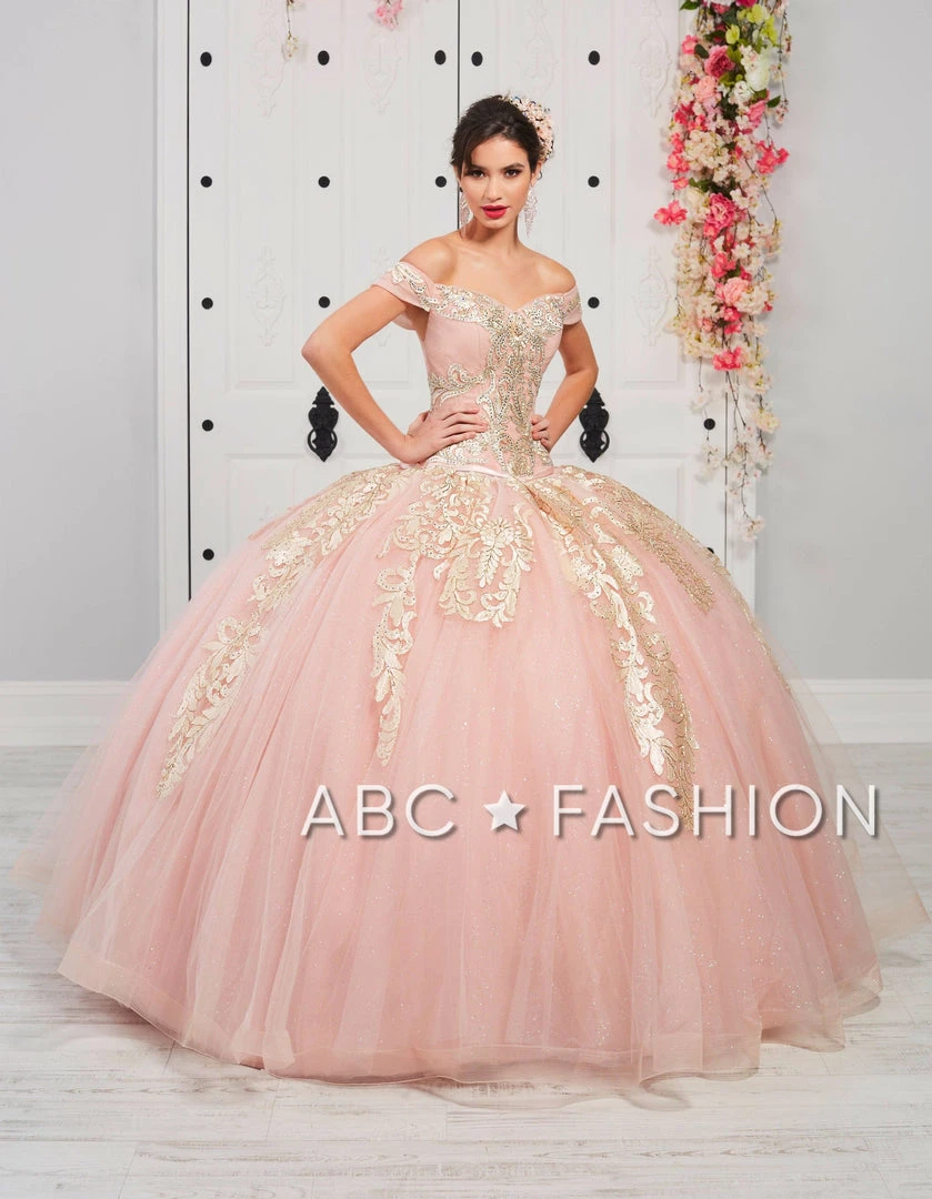 Look picture-perfect in this gold applique off the shoulder ball gown with A-line skirt by House of Wu LA Glitter 24053. Make a statement in this gorgeous long off the shoulder sweetheart dress. The bodice and tulle skirt is adorned with gilded gold lace appliques and beaded embroidery. This look is finished with a corset back.