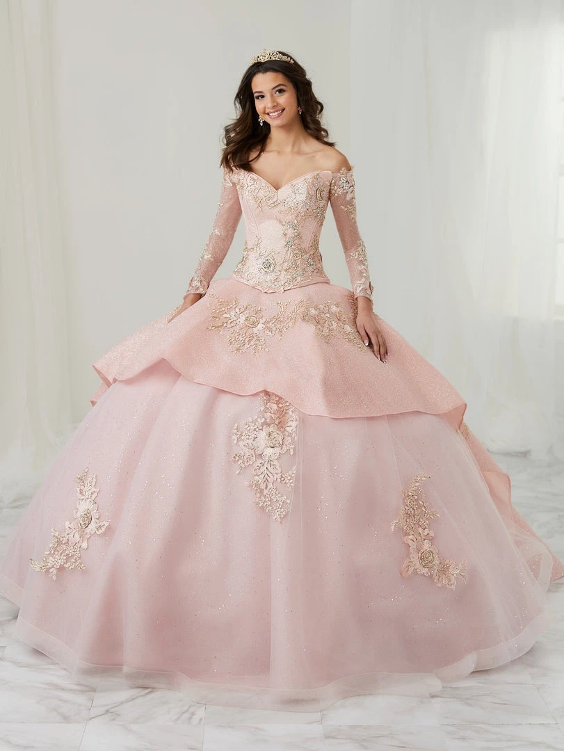 Captivate the room in this long sleeve off the shoulder ball gown with A-line skirt by House of Wu LA Glitter 24085. Make a statement in this gorgeous long sleeve off the shoulder sweetheart neckline ball gown. The bodice is accented with exposed boning and 3-dimensional flowers, that continue on the overskirt of the gown. Glitter tulle adds drama to the skirt. This look is finished with a corset back.