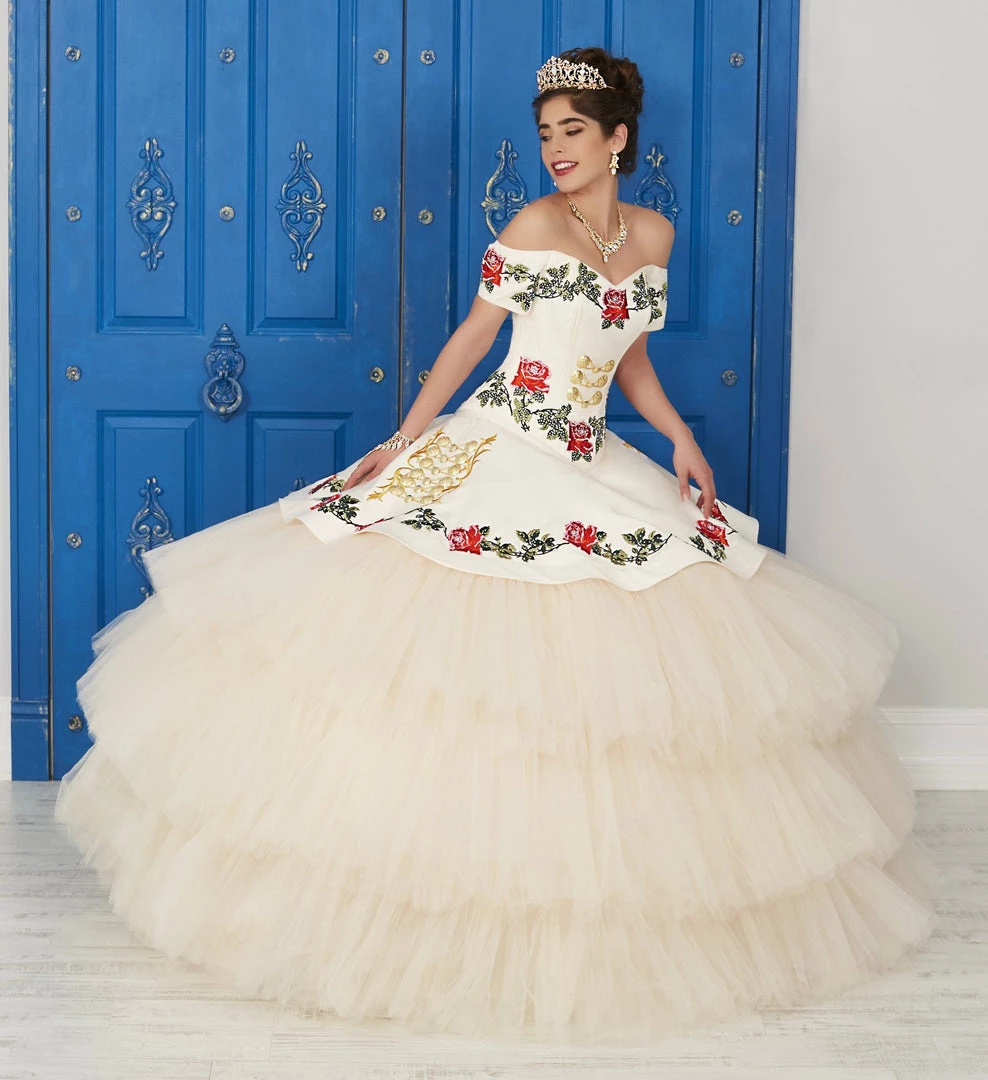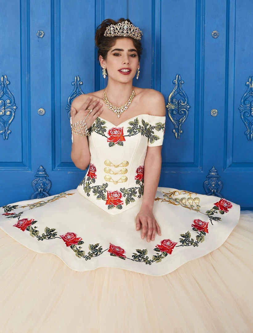 Make a bold statement in this floral off the shoulder Charra 2-piece ball gown by House of Wu LA Glitter 24035. The bodice is accented with corset boning, medal medallions, and beautifully decorated with multi-colored floral Charro embroidery. Cascades of ruffle tulle add dramatic volume to finish this floor length tiered skirt. To add an element of surprise, the organza and glitter tulle skirt can be removed to show a matching whimsical short little dress.