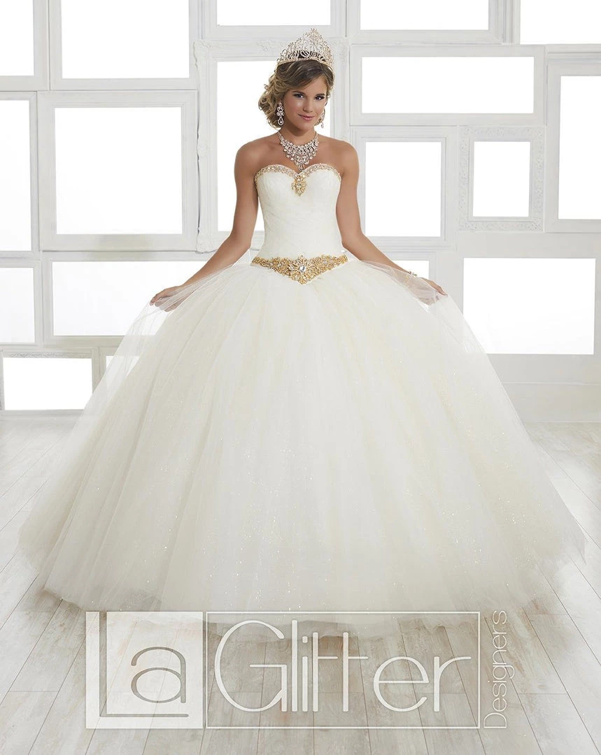 Make a lasting impression in this beaded long strapless glitter dress with A-line skirt by House of Wu LA Glitter 24030. The sweetheart bodice made in an enticing crisscross tulle pattern has radiant beading that shines like the sun. Has a full tulle and sparkle tulle ball gown skirt. A dress complete with a removable organza bow.