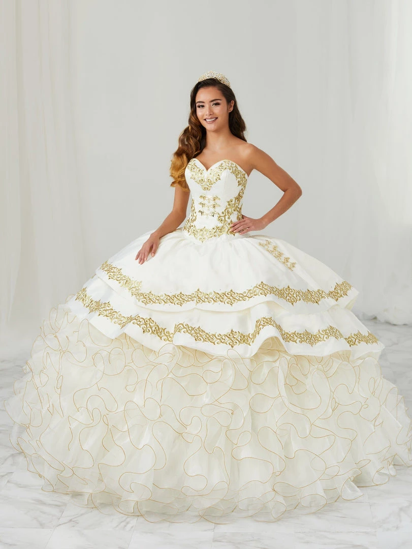 Make a grand entrance in this strapless charro ball gown with A-line ruffled skirt by House of Wu LA Glitter 24084. This gorgeous strapless princess ball gown features a decorated bodice of gold embroidery, exposed boning and equestrian inspired detail. The double tired satin overskirt is adorned with the matching gold embroidery and equestrian inspired design. Multi-ruffle organza layers trimmed in gold detail finish out the skirt.