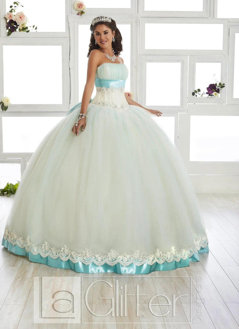 Look picture-perfect in this two-tone strapless A-line ball gown by House of Wu LA Glitter 24012. A starry sky kissed ball gown skirt with its two tons of glitter tulle. Hemmed by embroidered lace with metallic thread and shiny satin edge. The bodice has a pleated accent made from shiny satin and innumerable rhinestone bead work, particularly eye catching on the sweetheart neckline trim. Complete with huge satin bow and a lace up back.