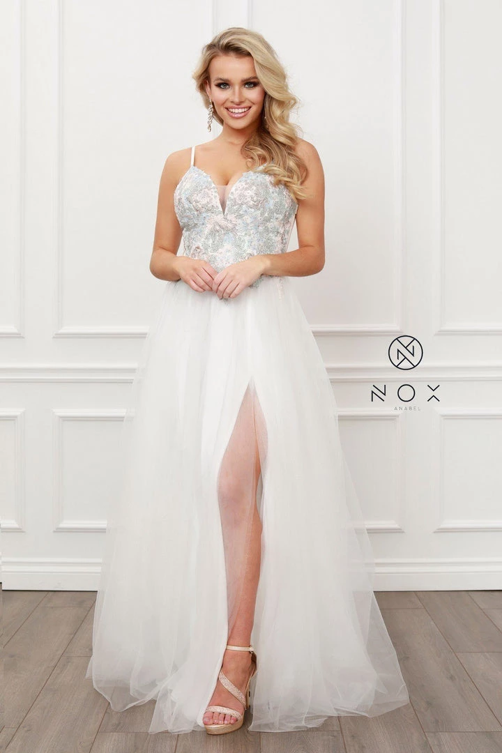 Look picture-perfect in this lace applique long V-neck dress with A-line skirt by Nox Anabel G445. This dress brings on the glam with the lace appliques adorning the fitted V-neck bodice and dreamy tulle skirt.