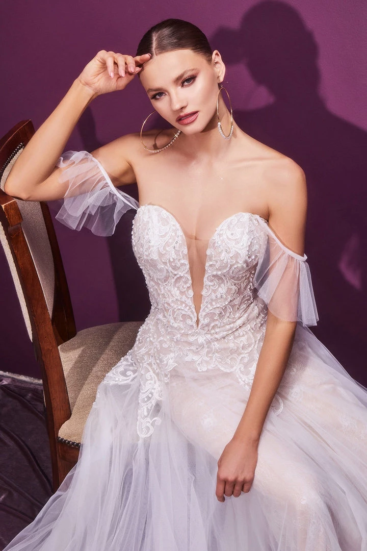 Look picture-perfect in this long strapless wedding dress by Cinderella Divine CD936W. This diaphanous gown features a strapless sweetheart bodice embellished with delicate lace appliquƩs and beaded accents. It has supportive internal boning and a plunging illusion v-neckline. The back is designed with corset-style lacing for a customized fit while the skirt flows to a gentle A-line silhouette cut from layers of frothy sheer tulle and Chantilly lace.