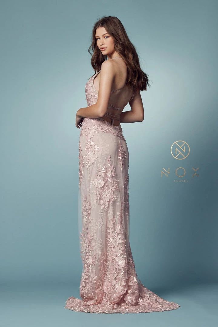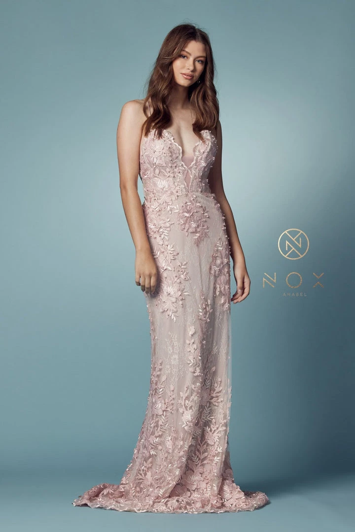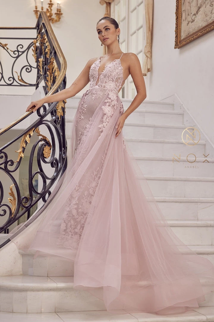 Look picture-perfect in this lace applique long deep V-neck fitted dress with A-line overskirt by Nox Anabel F485. With the stunning attention to details, you’ll love the hand-beaded floral details embellished throughout this gown.