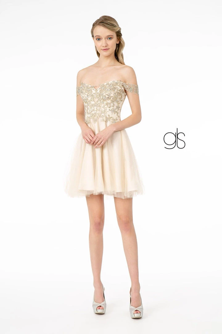 Look timeless in thisĀ short off the shoulder dress with embroidered lace appliques by Elizabeth K GS2862.