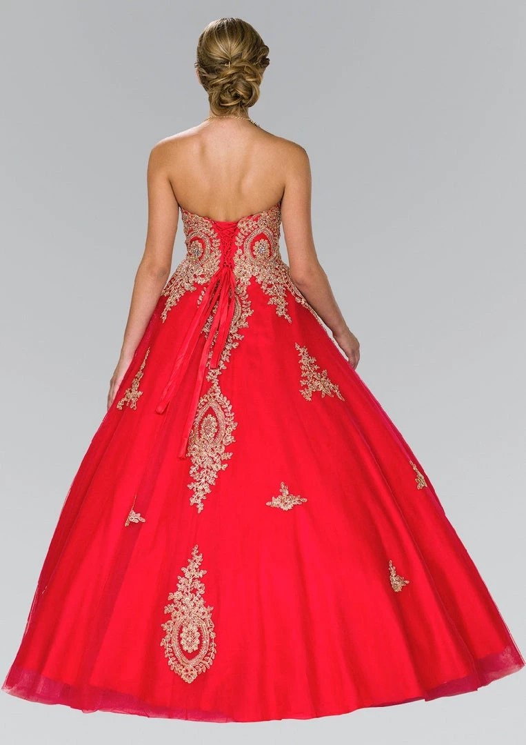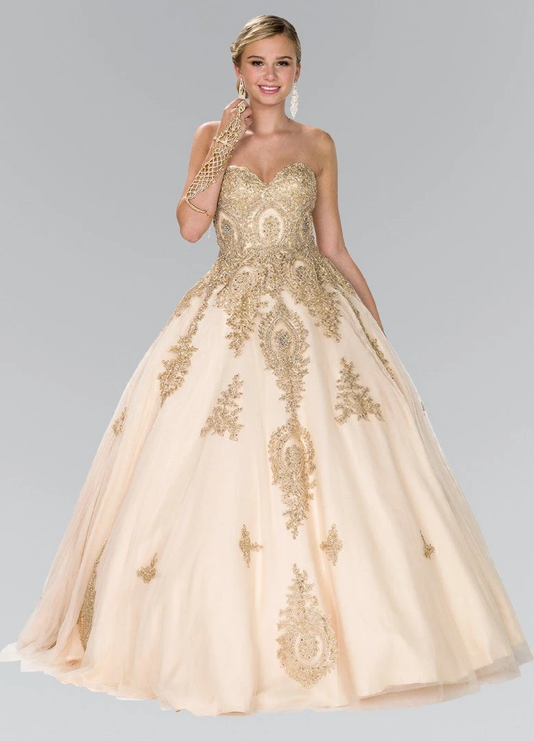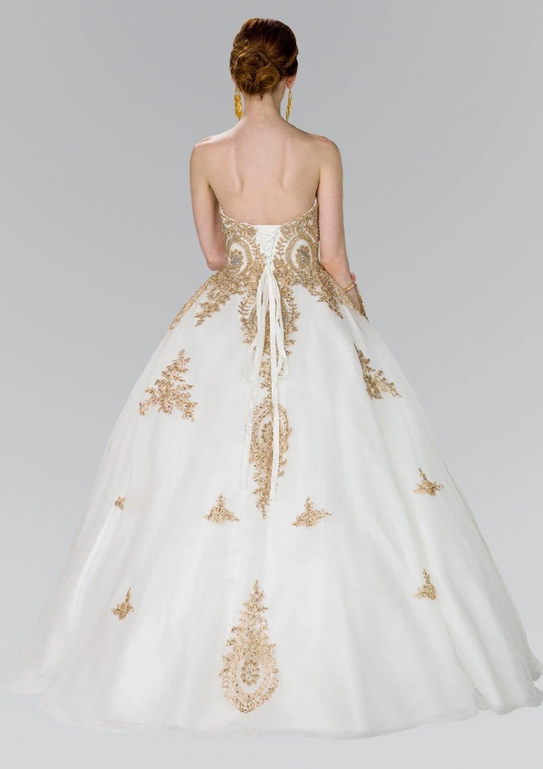 Light up the room in this strapless A-line dress with gold lace applique by Elizabeth K Style GL2379. This beautiful gown features a strapless sweetheart neckline, fully embellished with timeless gold lace applique, long A-line skirt, and a lace-up back.
