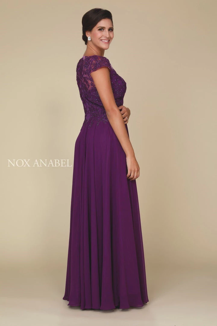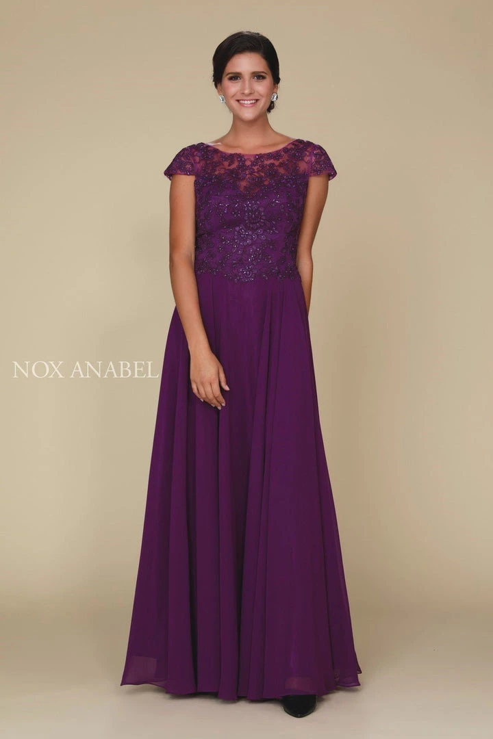 Make an impression in this short-sleeved gown with lace bodice by Nox Anabel Q508. This long evening gown features a boat neck bodice with beautiful beaded lace top, sheer embellished short sleeves, full length skirt that elegantly flows to the floor, and a zipper closure. Perfect as a Mother of the Bride dress or for any formal event!