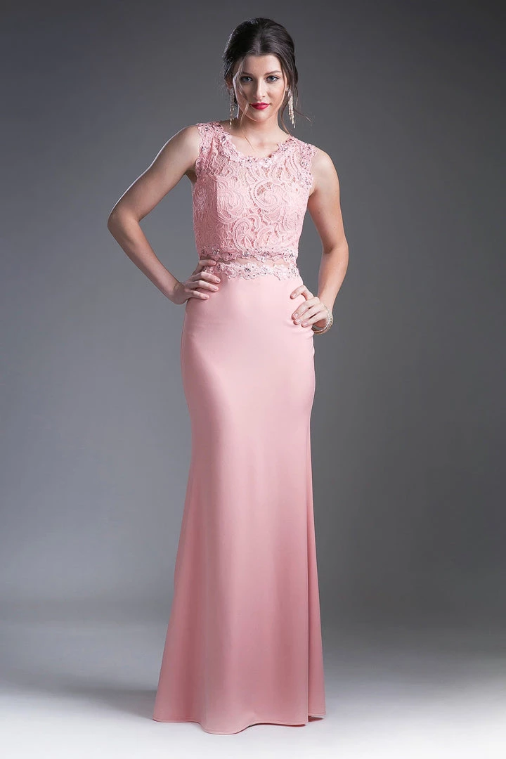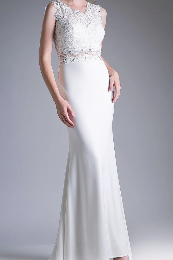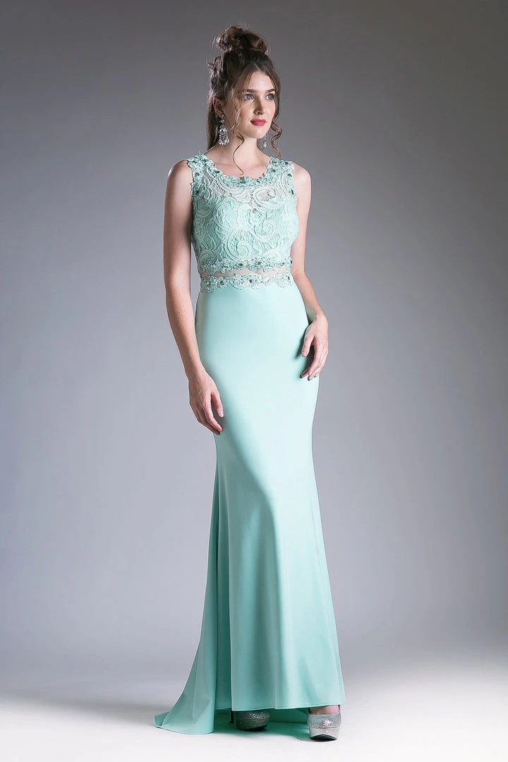 Look unforgettable in this long sleeveless mock two piece dress with lace bodice by Cinderella Divine CF115.