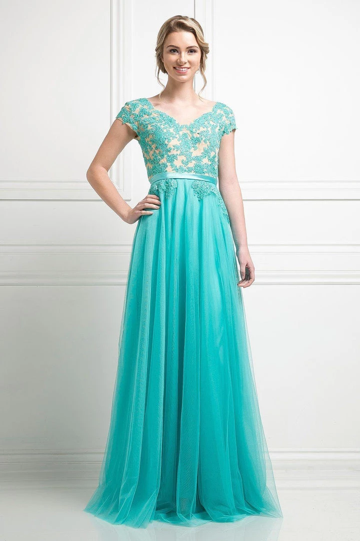Look modest chic in this short-sleeved long lace bodice dress with A-line skirt by Cinderella Divine KD022.