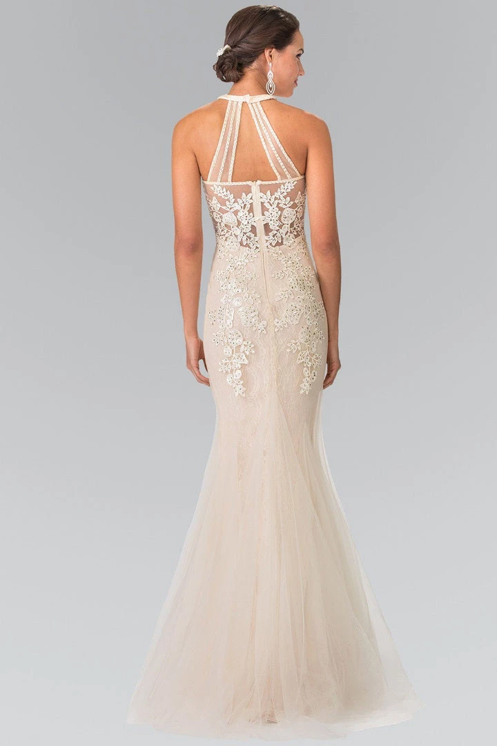 Fall in love with this long beaded lace halter mermaid dress by Elizabeth K. Made out of lace, this beautiful gown features lovely beaded lace applique and a slimming mermaid skirt.