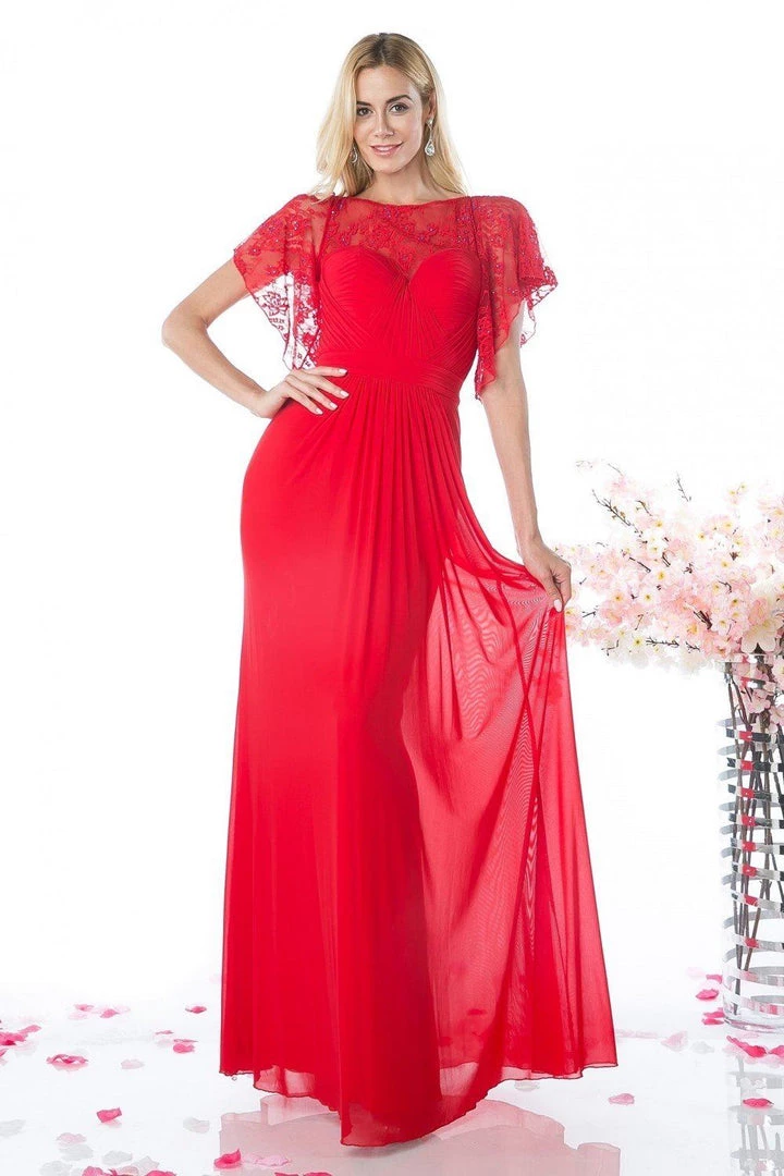 Look vintage chic in this fitted long beaded lace dress with short sleeves by Cinderella Divine CD494.