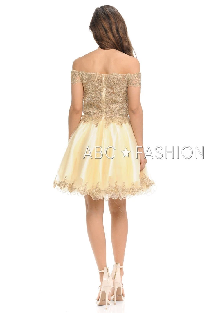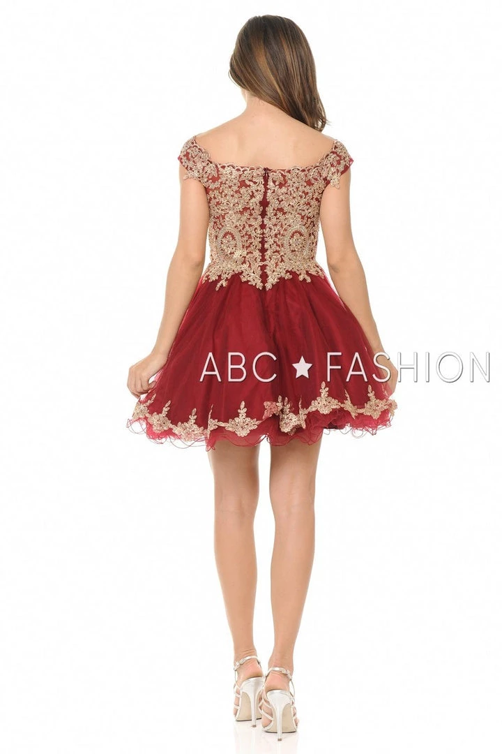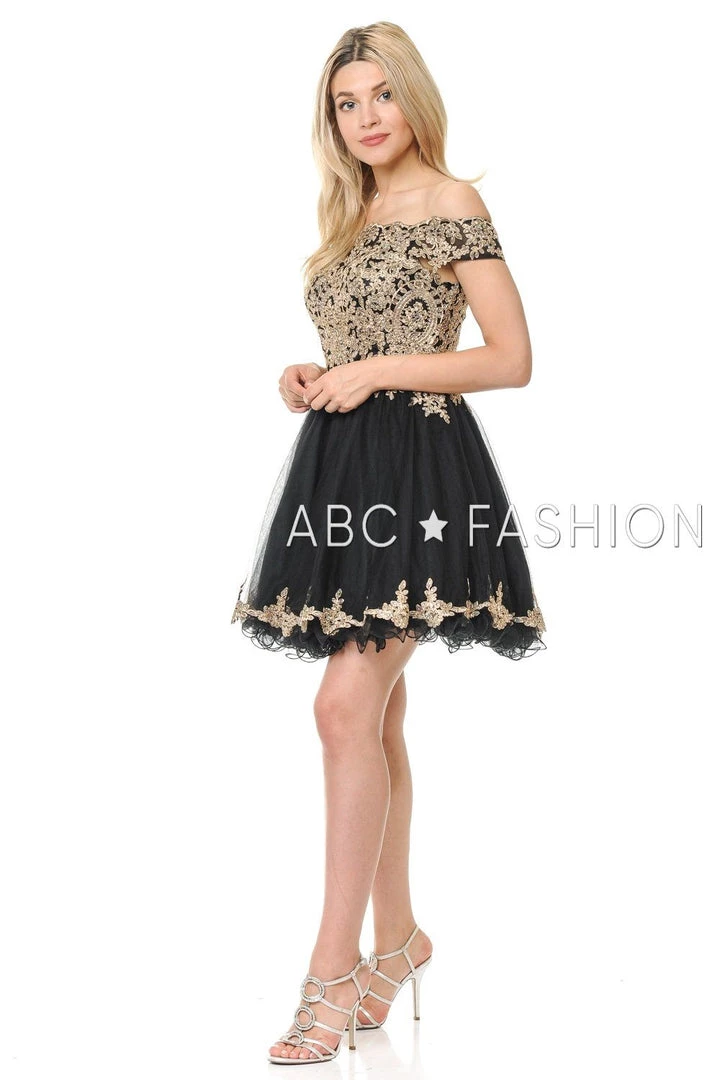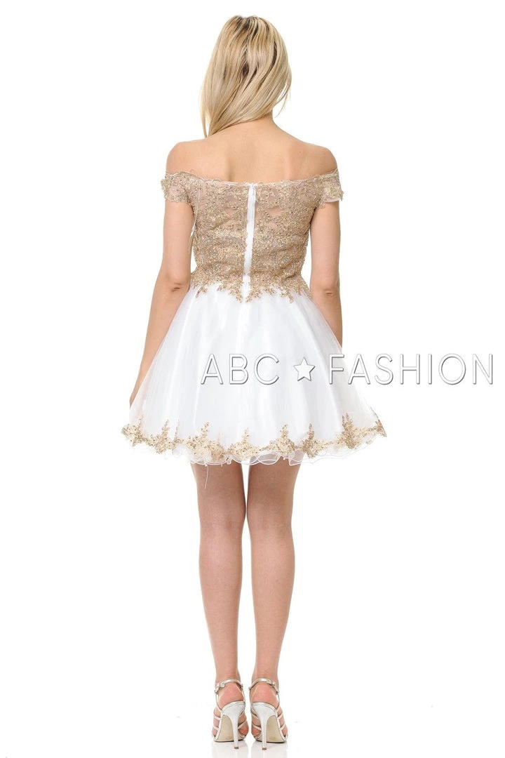 Look unforgettable in this tulle off-the-shoulder cocktail dress with embroidered gold lace appliques. This short party dress features a beautiful off shoulder bodice adorned with gilded gold lace appliques accented with dainty beads, the short A-line tulle skirt with curly hemline gently falls above the knees, and a zipper back. Affordably priced under $170, this dress is perfect for any semi-formal event and will keep you on budget!