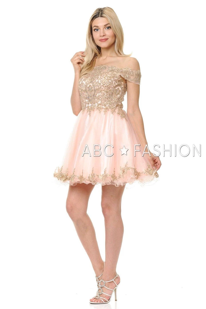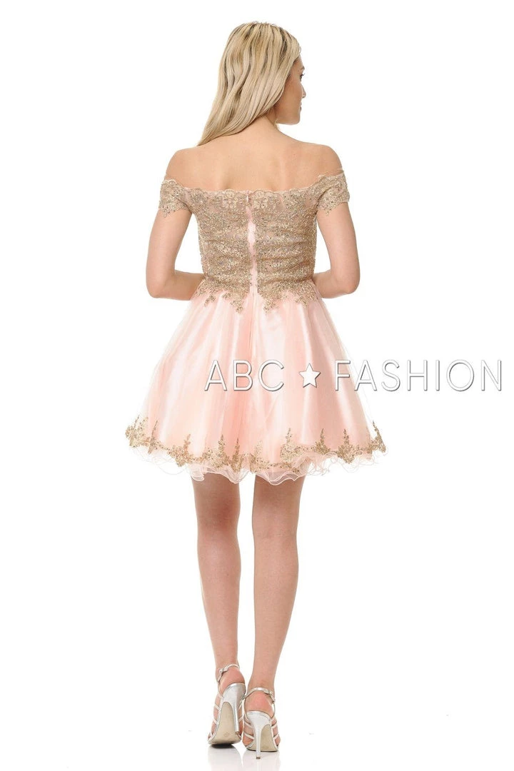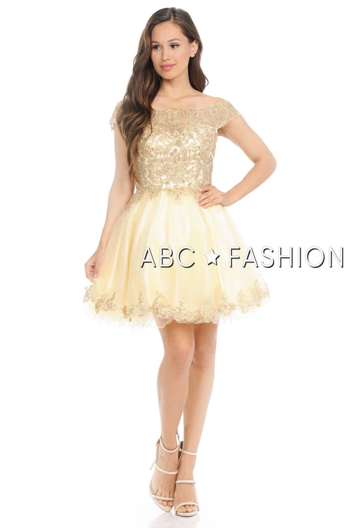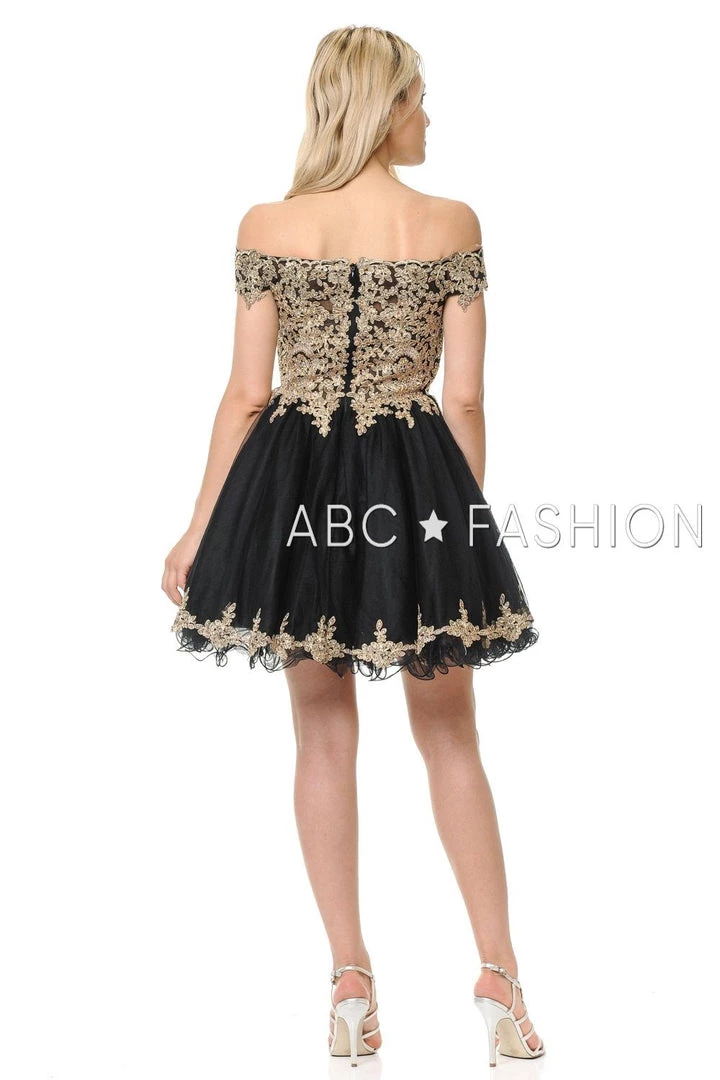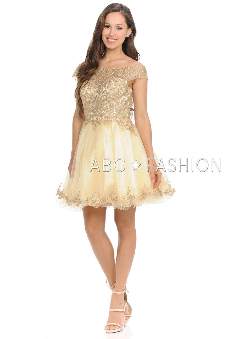 Look unforgettable in this tulle off-the-shoulder cocktail dress with embroidered gold lace appliques. This short party dress features a beautiful off shoulder bodice adorned with gilded gold lace appliques accented with dainty beads, the short A-line tulle skirt with curly hemline gently falls above the knees, and a zipper back. Affordably priced under $170, this dress is perfect for any semi-formal event and will keep you on budget!