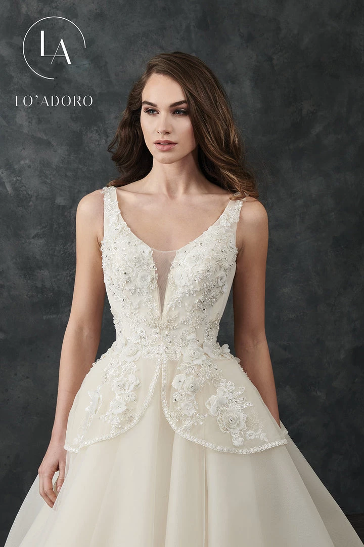 Enjoy your night in this long strapless wedding dress with A-line skirt by Mary’s Bridal Lo’ Adoro Collection M668. Modern and traditional come together to create this tulle peplum V-neck ball gown. The applique gives you a modern feel while the lace up back keeps this look traditional.