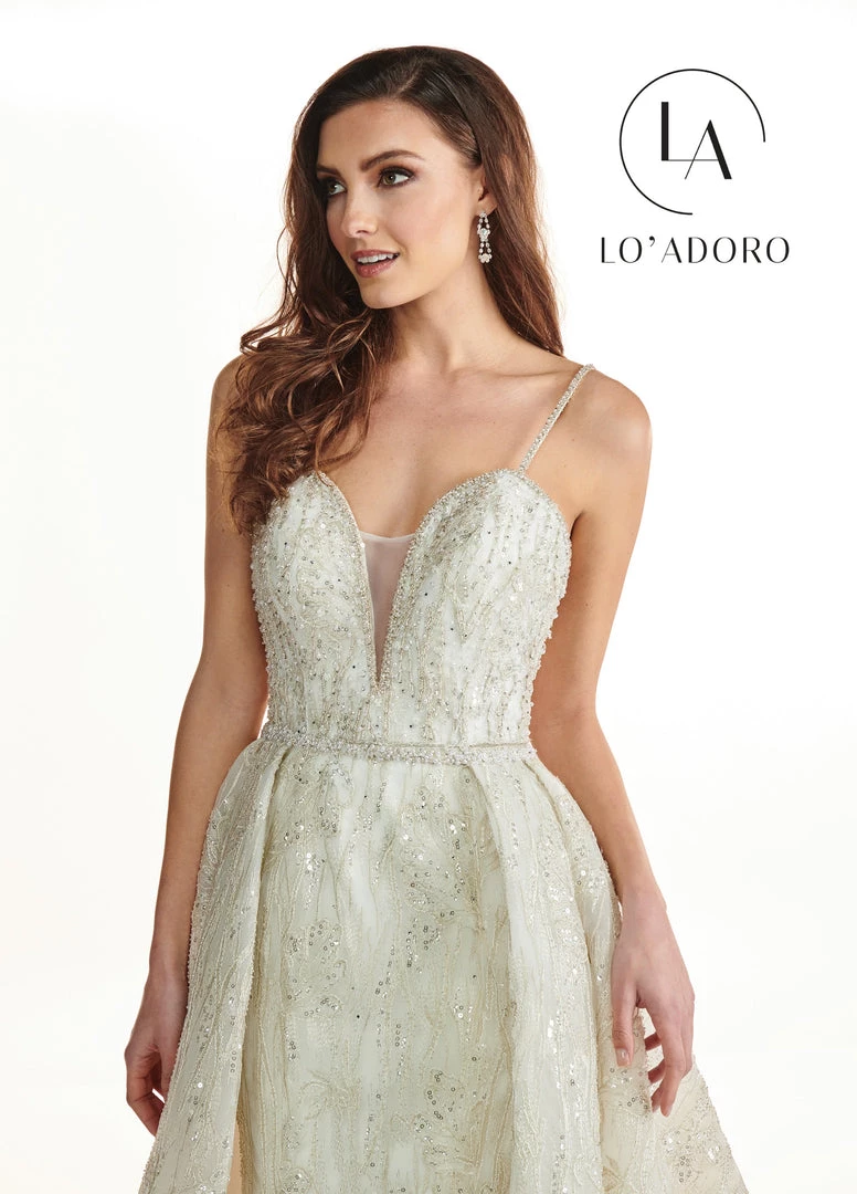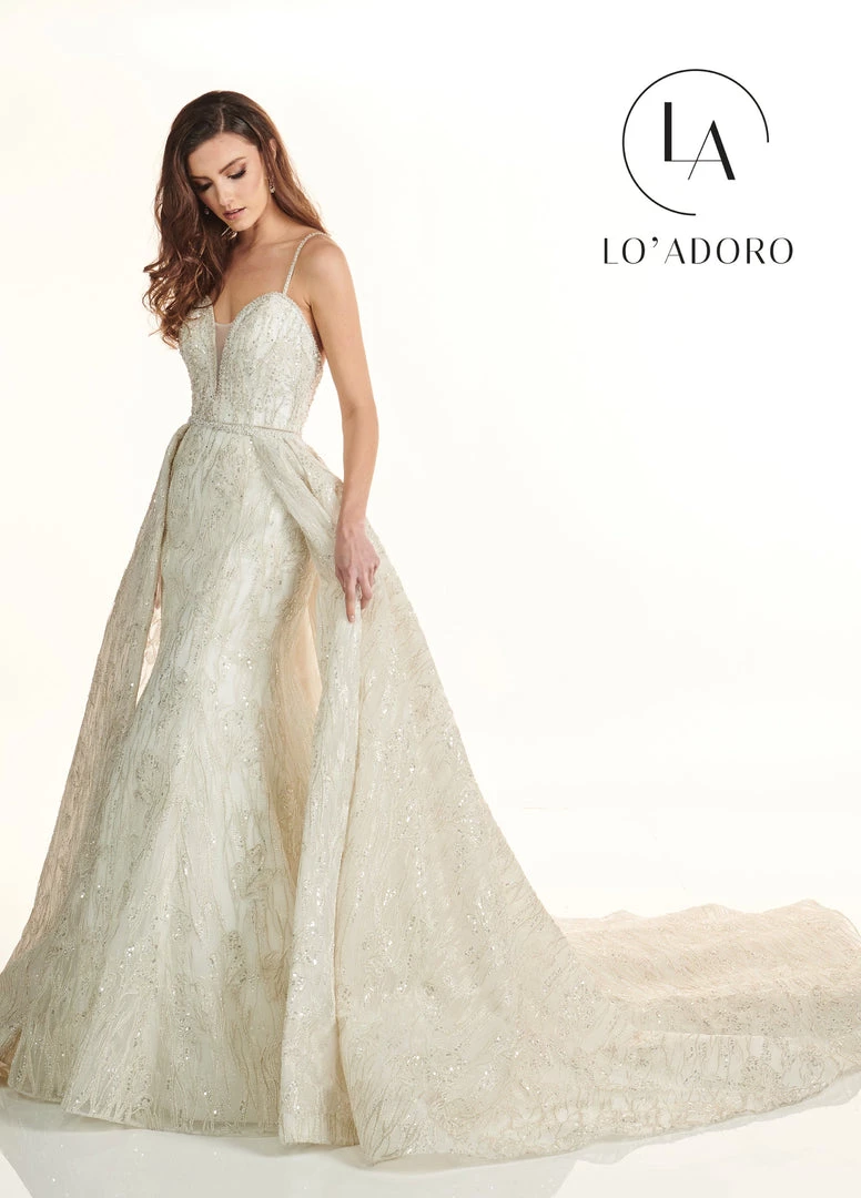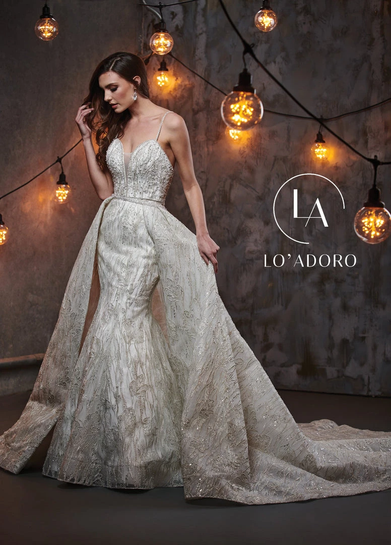 Make a grand entrance in this long sleeveless wedding dress with detachable overskirt by Mary’s Bridal Lo’ Adoro Collection M743. Two looks in one? Yes, please! This embroidered tulle trumpet gown has an astonishing matching embroidered overlay that creates a dramatic effect for any bride. Embellished and sparkling from top to bottom, the embroidered detail speaks for itself.