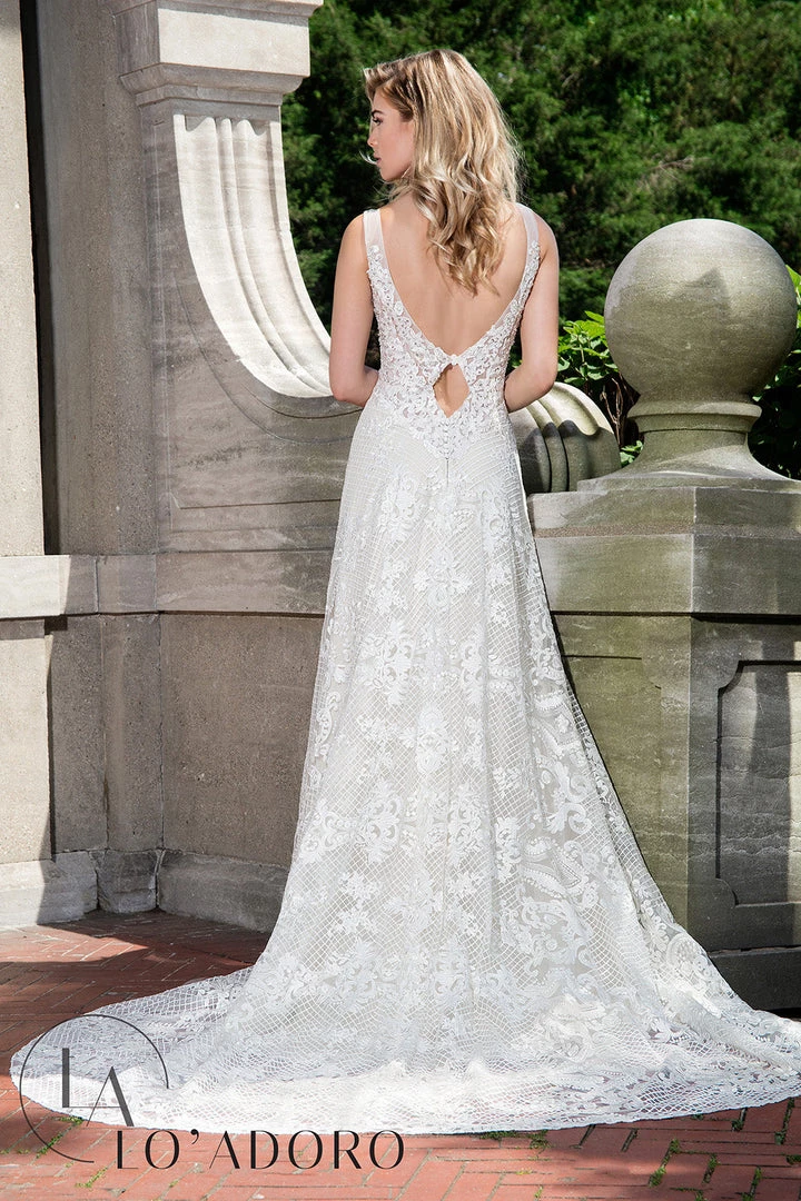 All eyes will be on you in this long sleeveless wedding dress with A-line skirt by Mary’s Bridal Lo’ Adoro Collection M622. Loving you is natural. Walk down towards your fiance and soon to be husband in this sweetheart dress. The embroidery covers the dress to give you a sophisticated feel. This dress features a sweetheart neckline with open back and with lace embroidery from top to bottom.