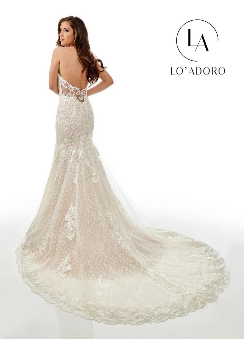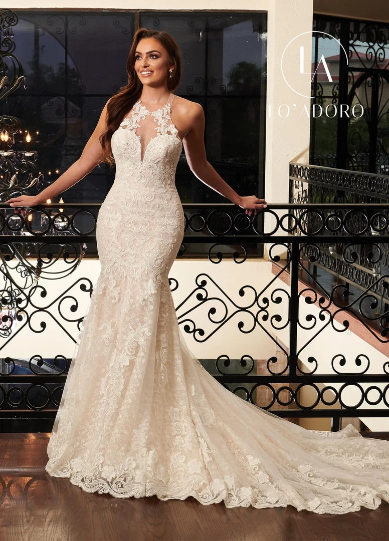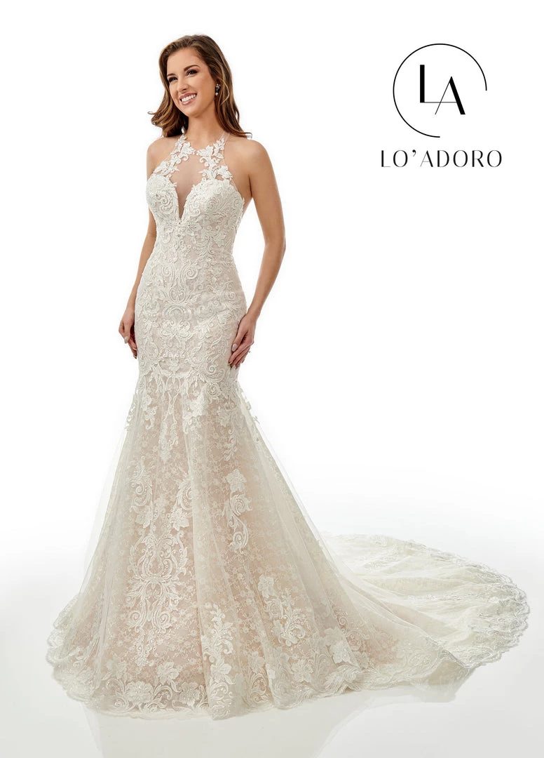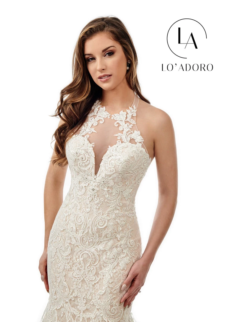 All eyes will be on you in this long sleeveless halter wedding dress with fitted skirt by Mary’s Bridal Lo Adoro Collection M763. Timeless and graceful baroque style lace applique adorn this gown with a sheer halter yoke and a sweetheart neckline. The gown and yoke have been beautifully accented with hand-placed applique which cascades down through the flared skirt. The soft shimmer lace underlay of this gown glistens with whimsical beauty. The gown finishes with a sheer back bodice and a sheer chapel length train.