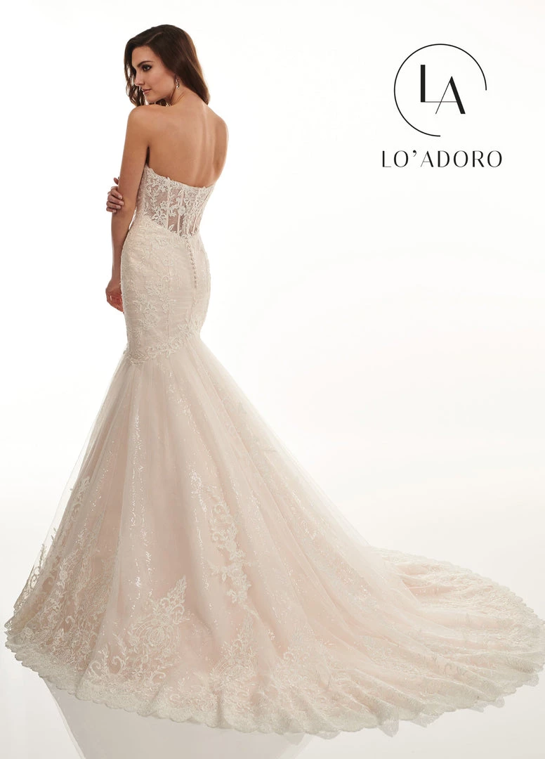 All eyes will be on you in this long strapless wedding dress with fitted skirt by Mary’s Bridal Lo’ Adoro Collection M732. This breathless, sweetheart wedding gown is everything you’ve ever imagined. This dress was designed to have pleated tulle on the bodice, topped with lace applique detailing, and sequin tulle underneath. The back detail includes a mesh panel with exposed boning and covered buttons.