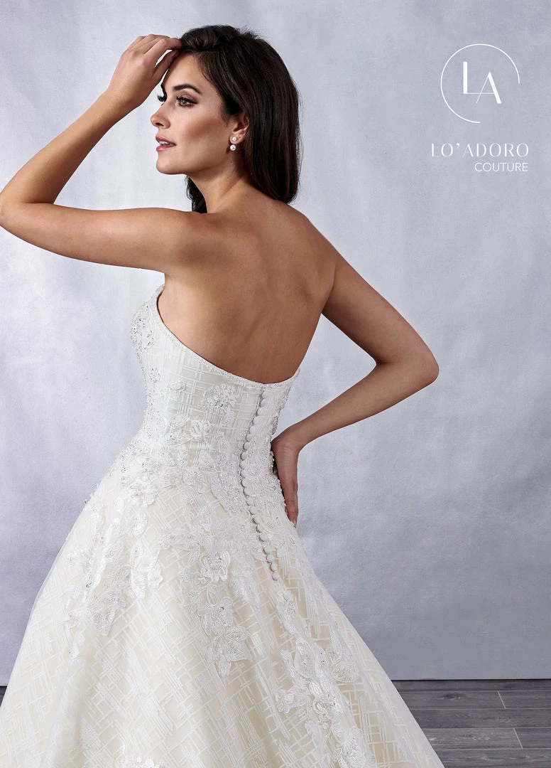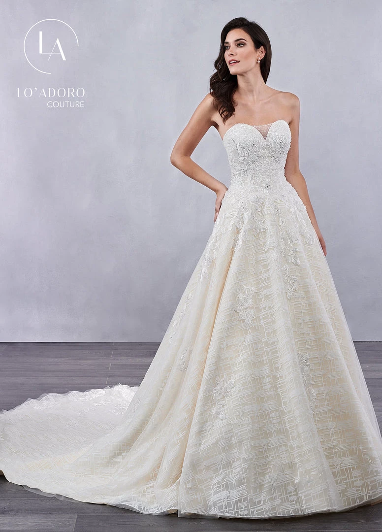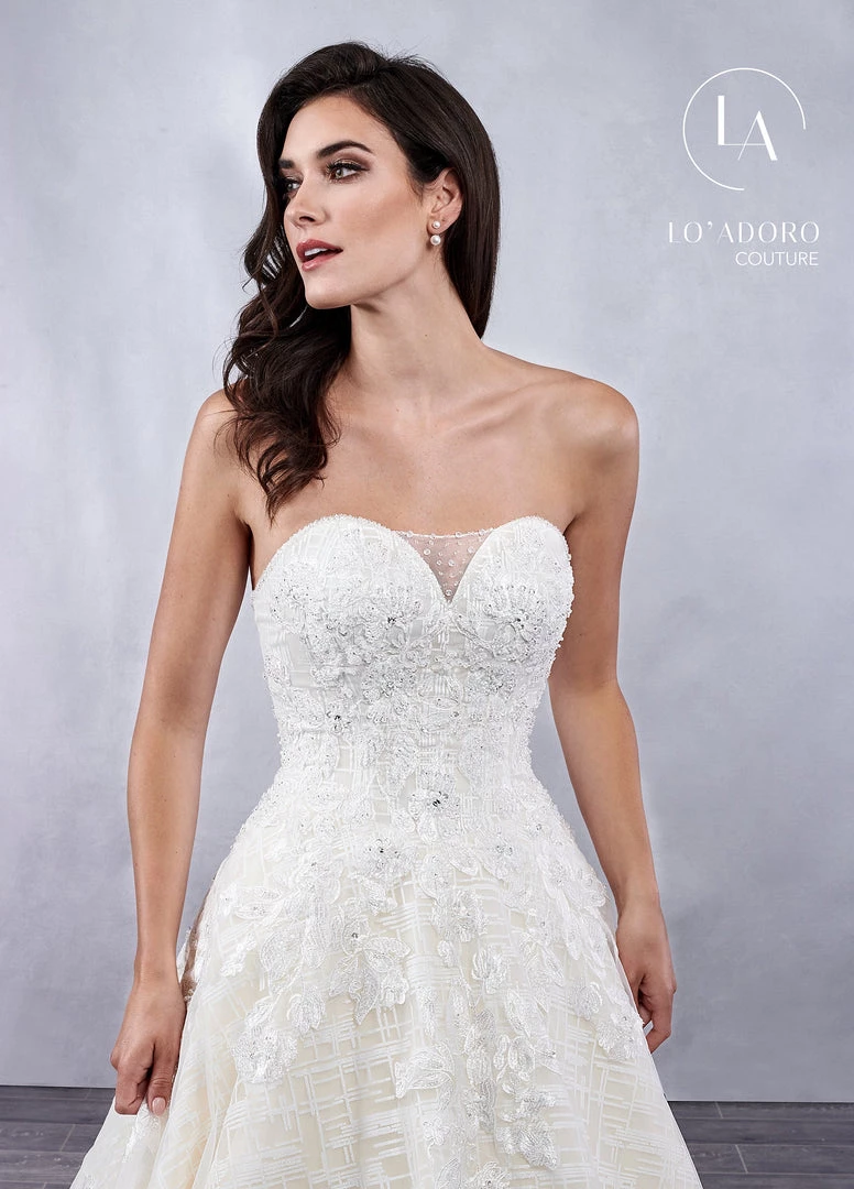 All eyes will be on you in this long strapless wedding dress with A-line skirt by Mary’s Bridal Lo’ Adoro Collection M715. Elaborately adorned strapless A-line wedding gown with a sweetheart illusion neckline, glitter tulle underlay, and covered button closure. The gown features embroidered lace applique on the bodice and cascading down the skirt to the bottom of the chapel length train.