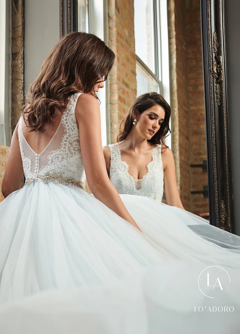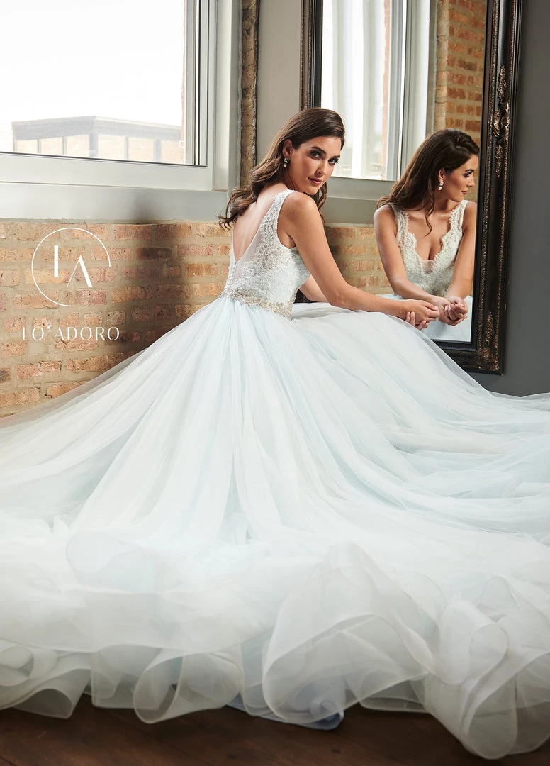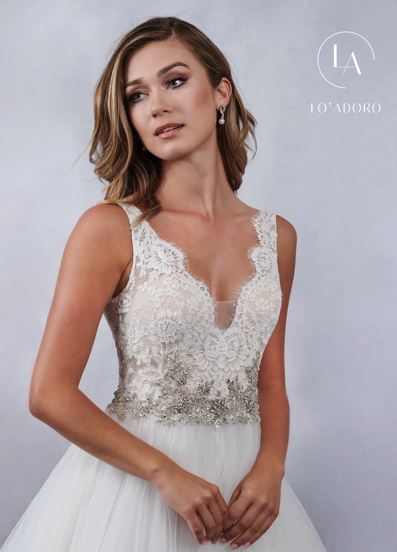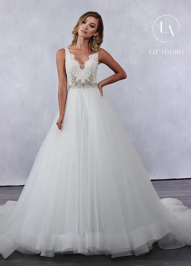 Make memories in this long sleeveless wedding dress with A-line skirt by Mary’s Bridal Lo’ Adoro Collection M694. Diaphanous tulle wedding dress with an alencon lace overlay bodice, v-shaped neckline, and a sheer neckline detailing. The natural waist is accented with a crystal and diamante beaded trim. The gown finishes with a full circular tulle skirt, horsehair trim, and a chapel length train.