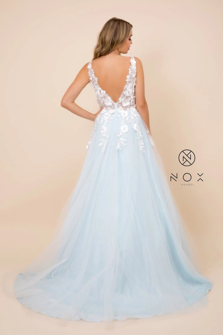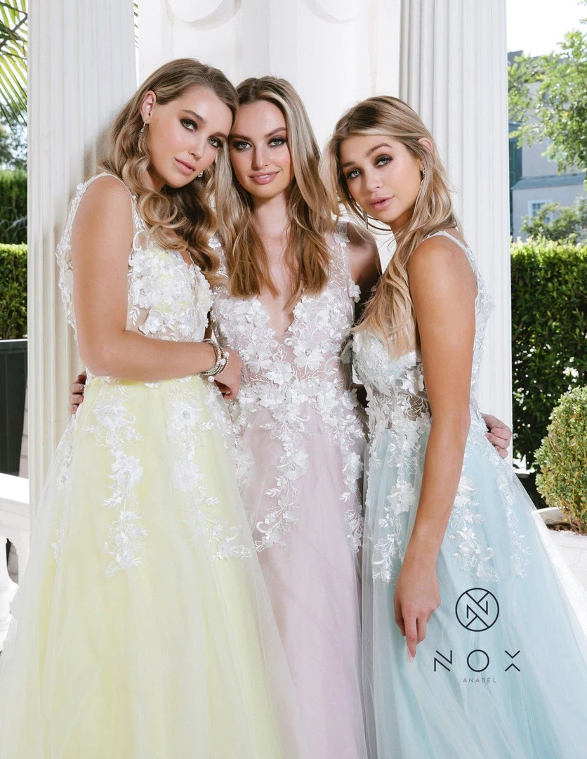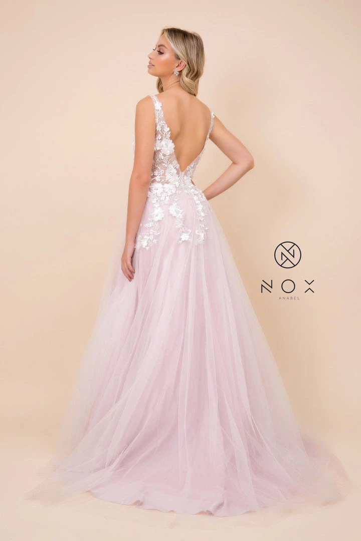 You’ll love twirling around in this long A-line illusion bodice dress with 3-dimensional floral appliques by Nox Anabel F339.
