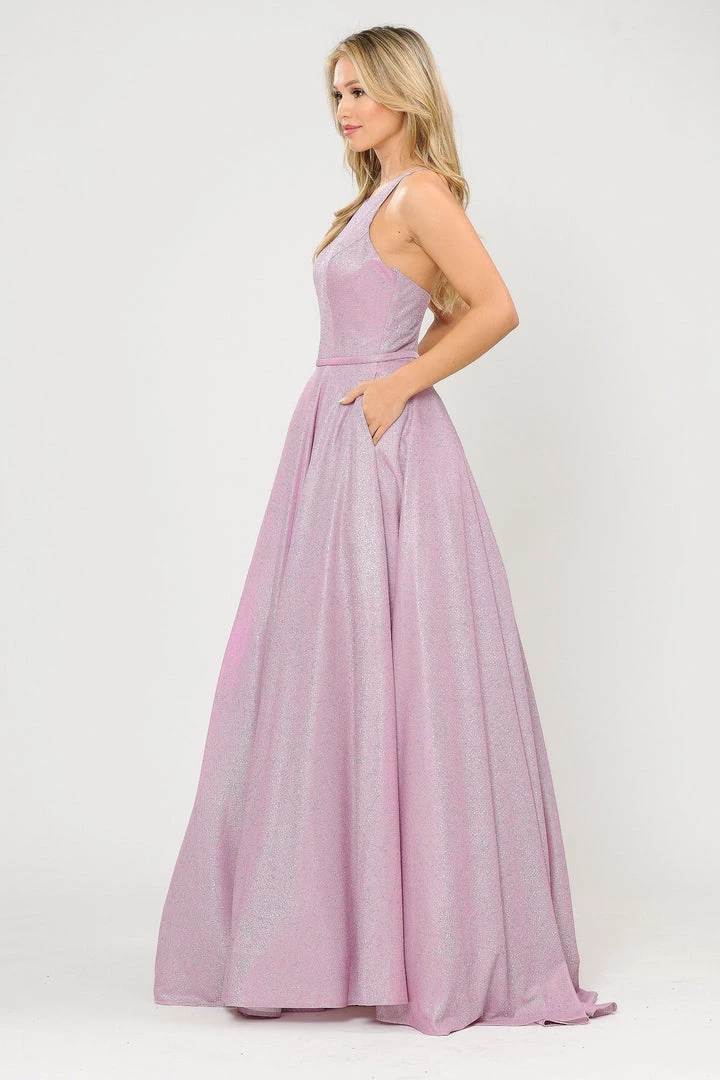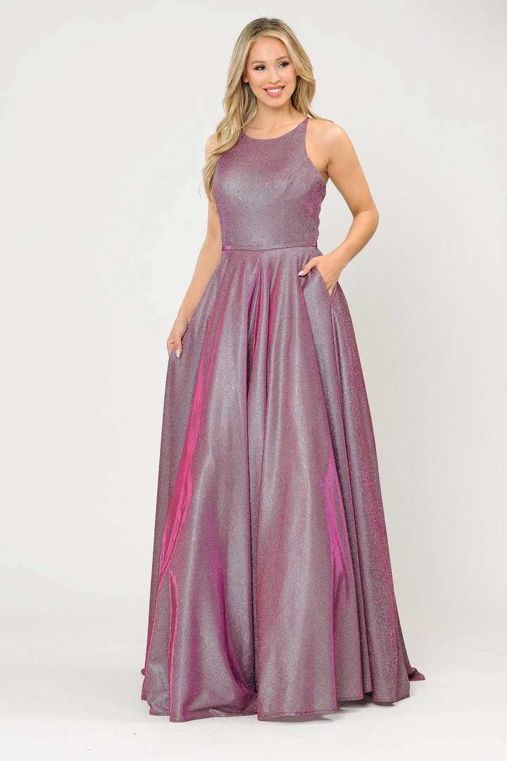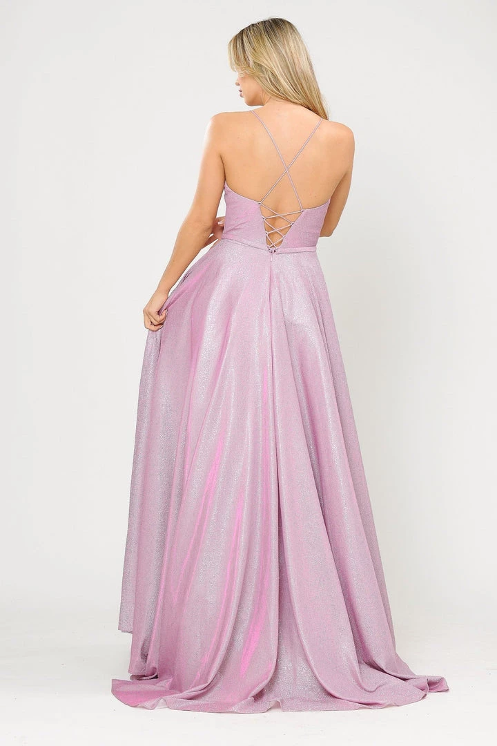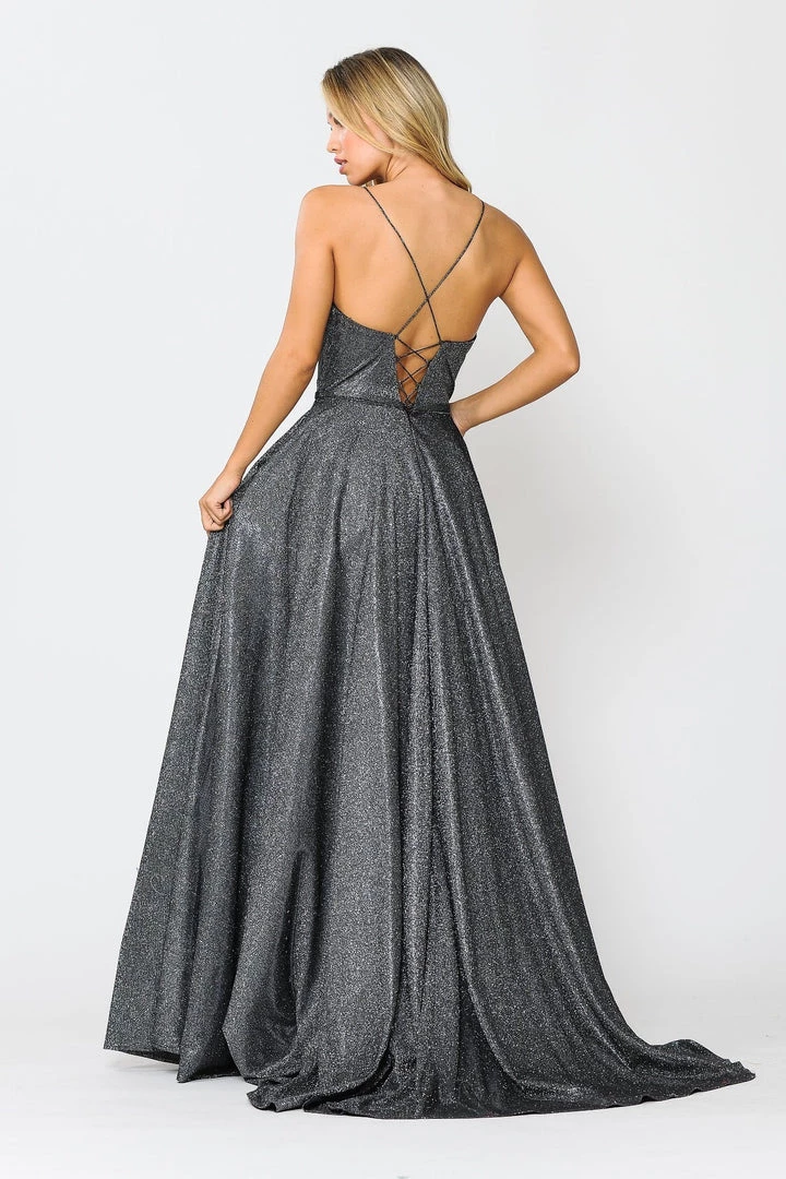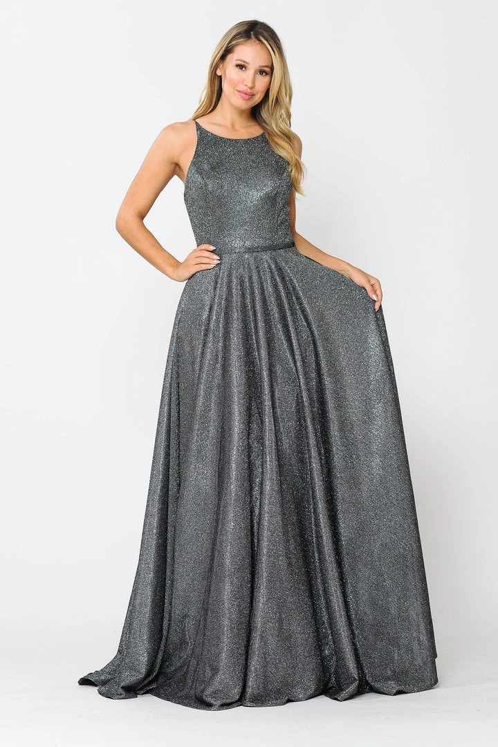 Look radiant in this long A-line metallic glitter dress with open corset back by Poly USA 8436. This beautiful formal gown features a sleeveless scoop neck bodice secured with spaghetti straps, open crisscross corset back, floor length A-line skirt with sweep train, and a lace-up back. Affordably priced under $250, this long evening dress is perfect for any formal event and will keep you on budget!