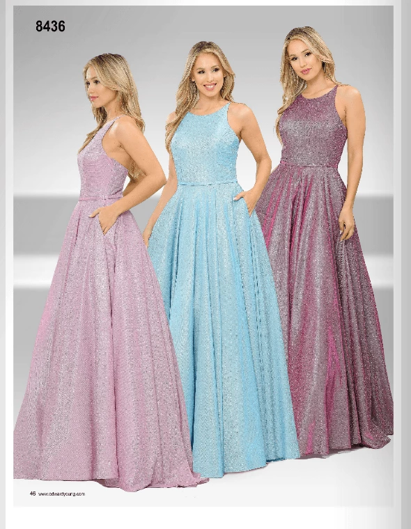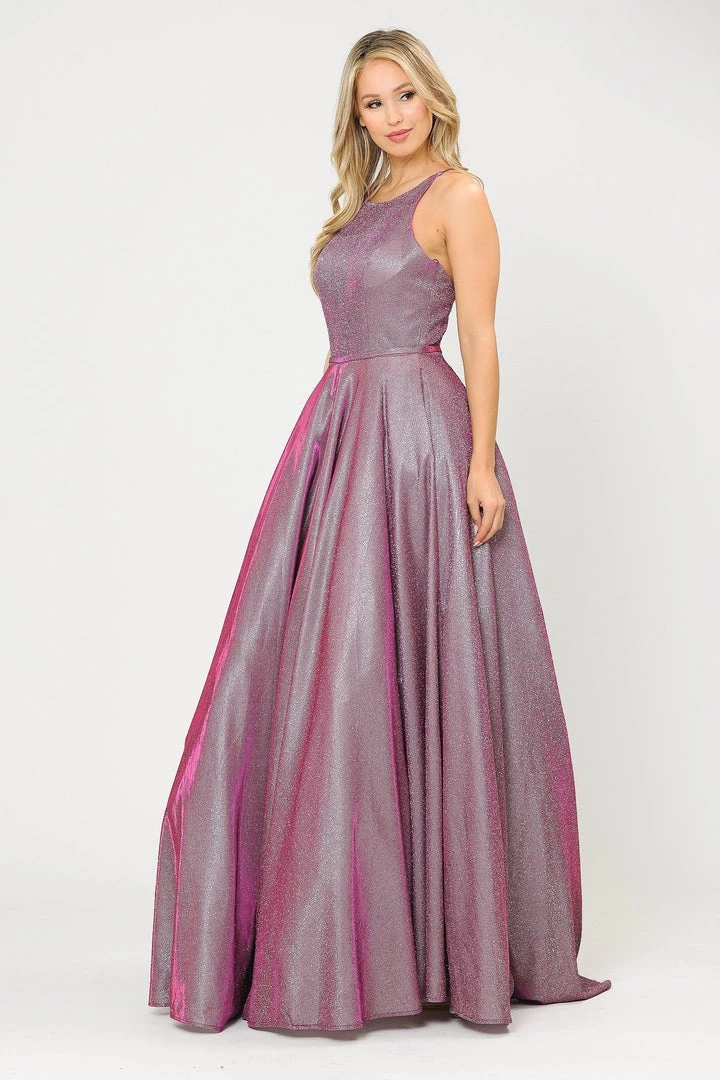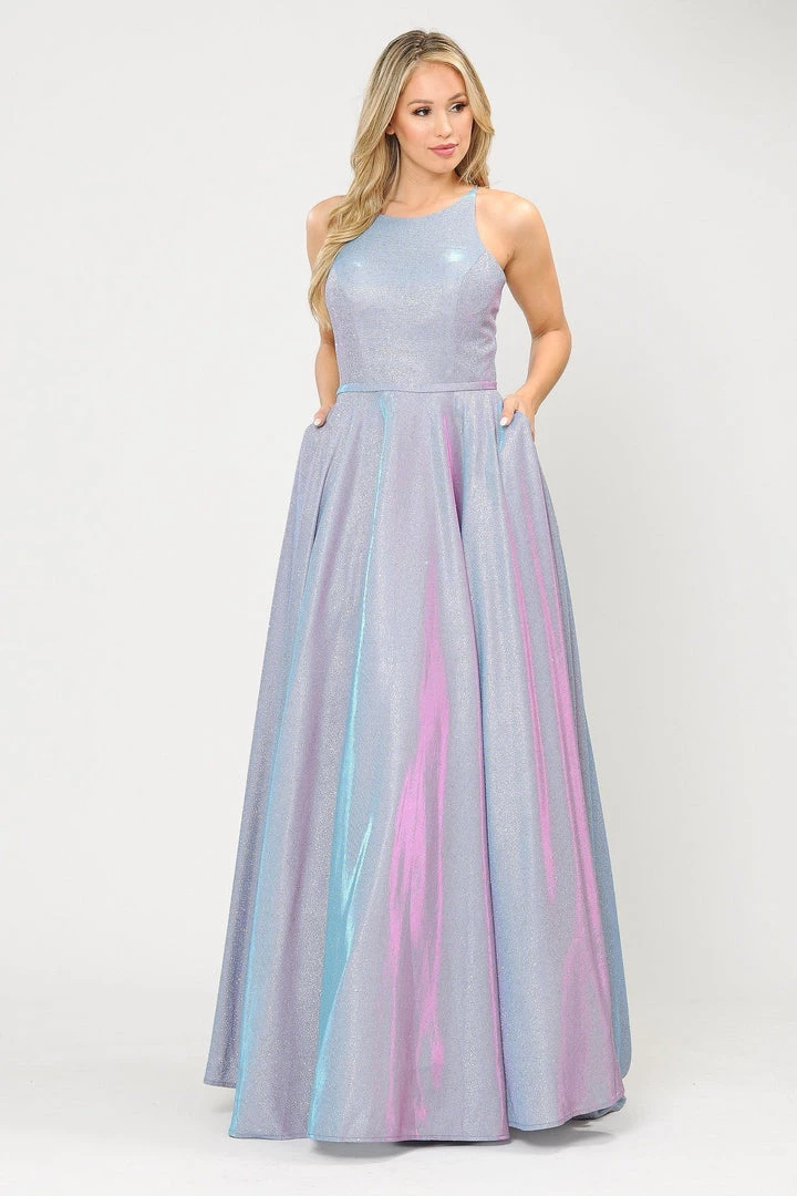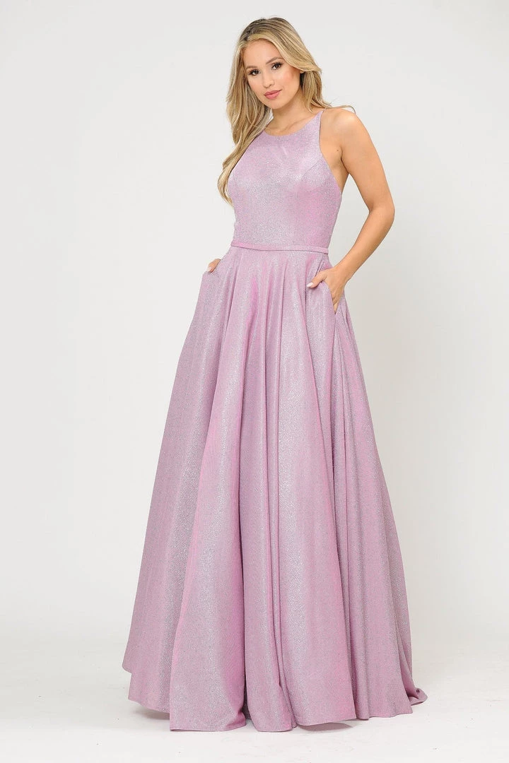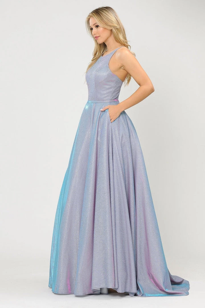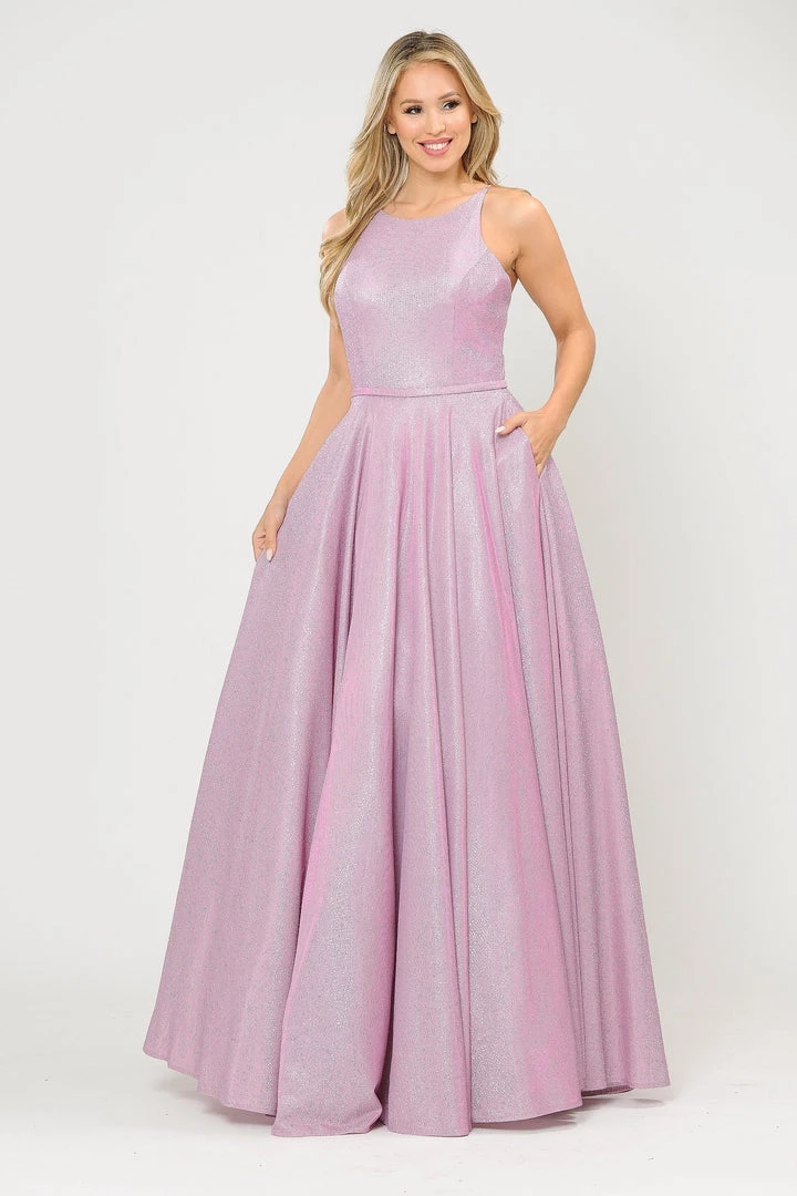 Look radiant in this long A-line metallic glitter dress with open corset back by Poly USA 8436. This beautiful formal gown features a sleeveless scoop neck bodice secured with spaghetti straps, open crisscross corset back, floor length A-line skirt with sweep train, and a lace-up back. Affordably priced under $250, this long evening dress is perfect for any formal event and will keep you on budget!