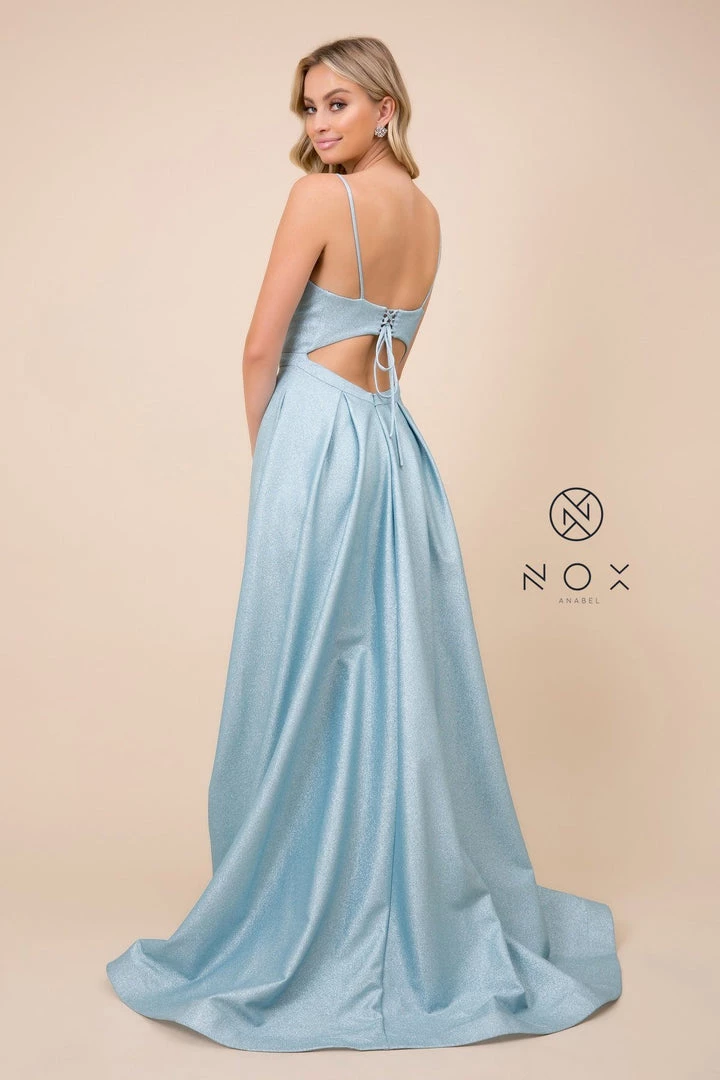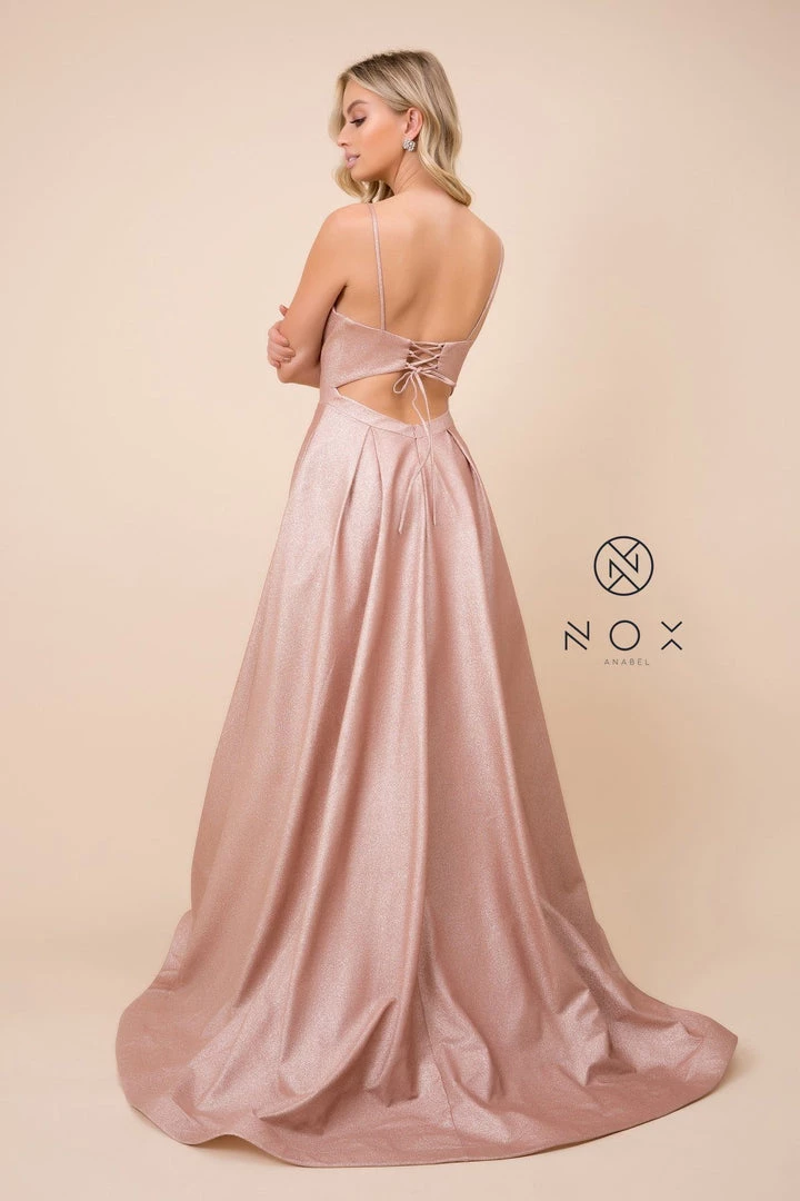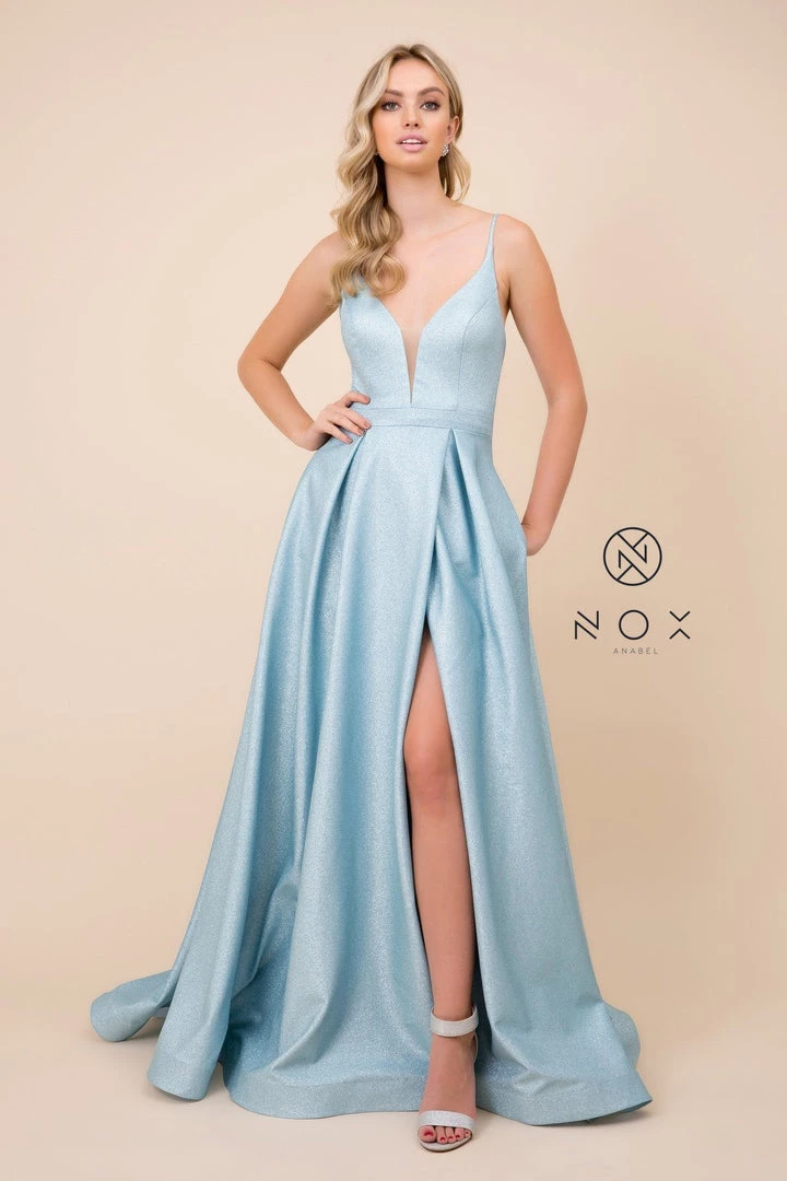 Dance the night away in this long A-line glitter knit dress with sheer V-neckline by Nox Anabel E379.
