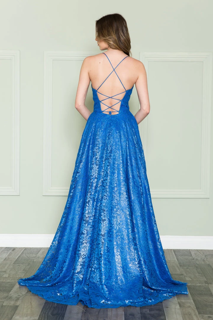 Take plenty of selfies in this long sleeveless lace A-line dress by Poly USA 8862. This beautiful lace gown features a round neckline bodice supported with spaghetti straps, lace-up back with adjustable straps, open back, floor length form fitting skirt with a sweep train, and a zipper closure.