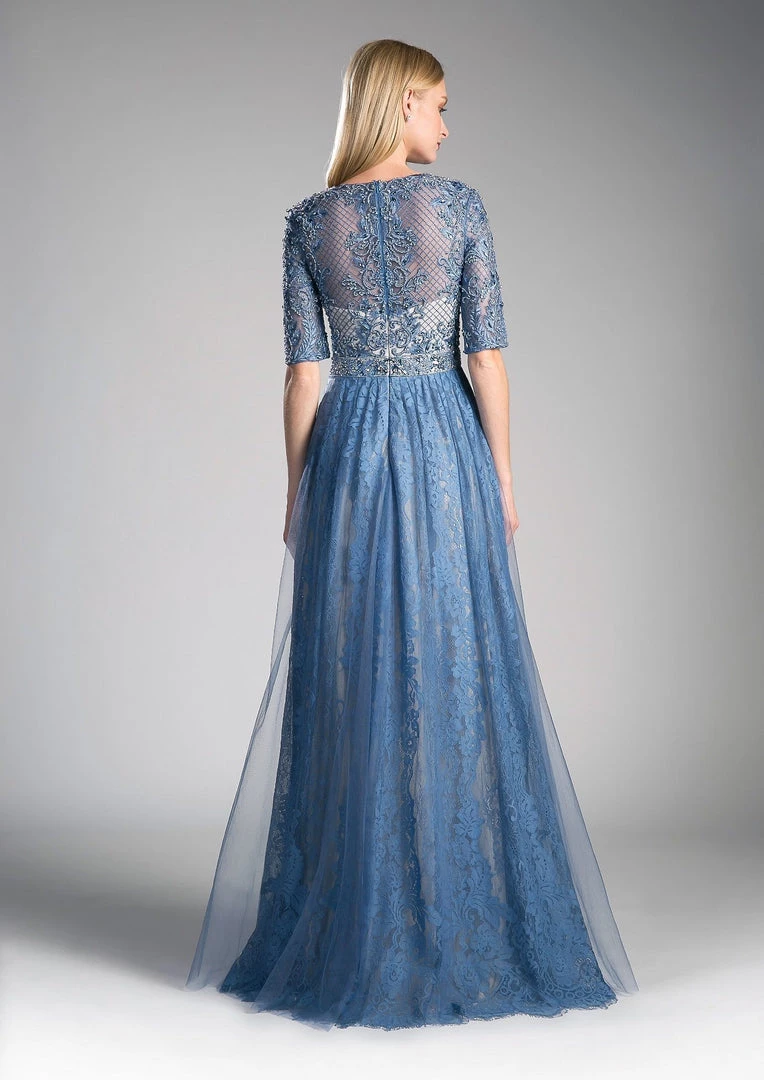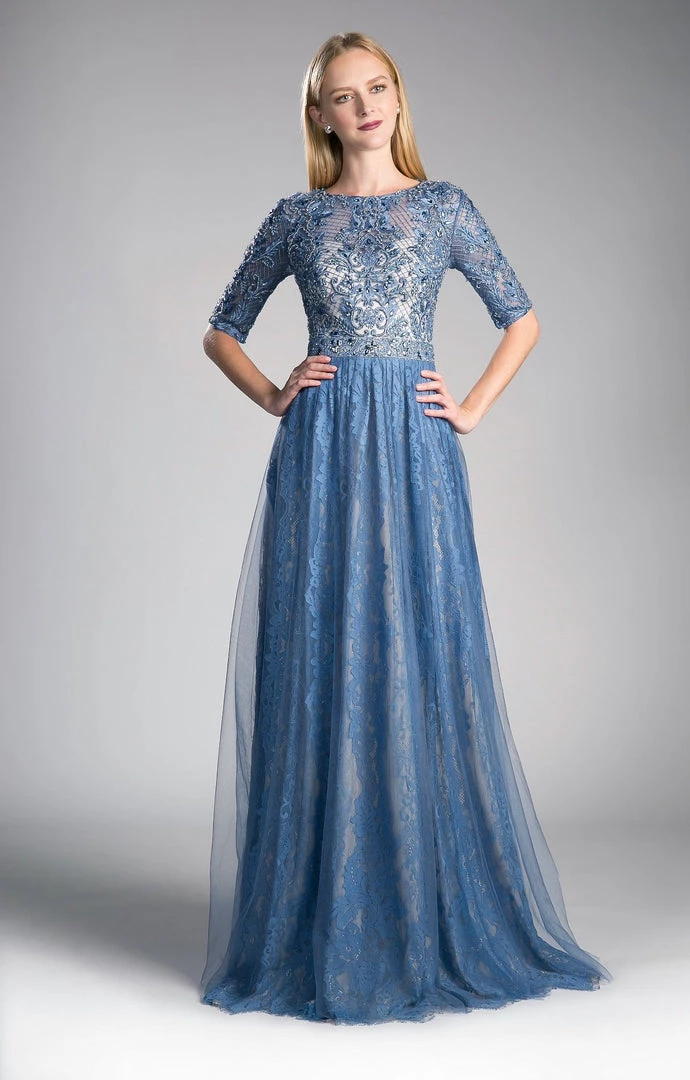 Light up the room in this long blue dress with mid-sleeves by Cinderella Divine CR813. This evening gown features a beautiful scoop neck bodice embellished with dazzling beaded embroidery, enclosed beaded back, a floor length A-line tulle skirt with the lace underskirt peeping through, and a zipper closure.