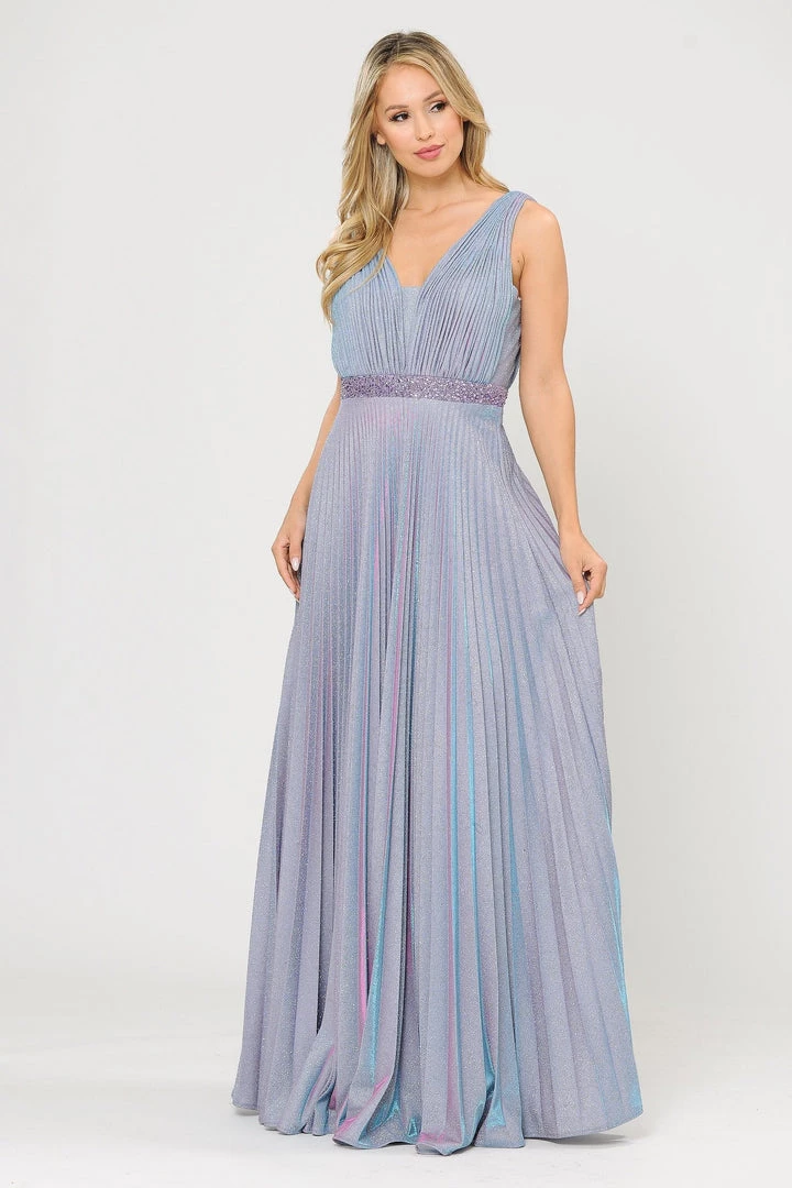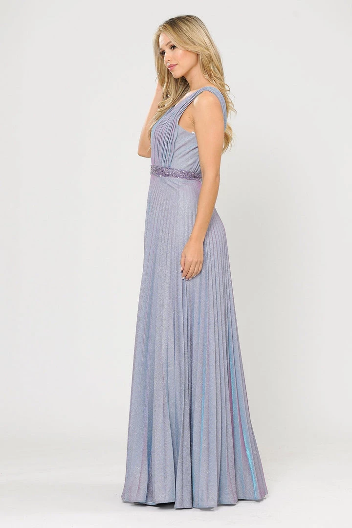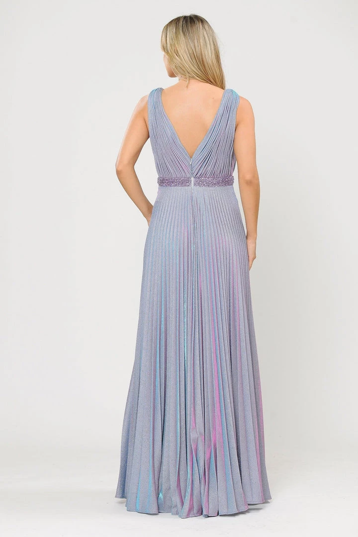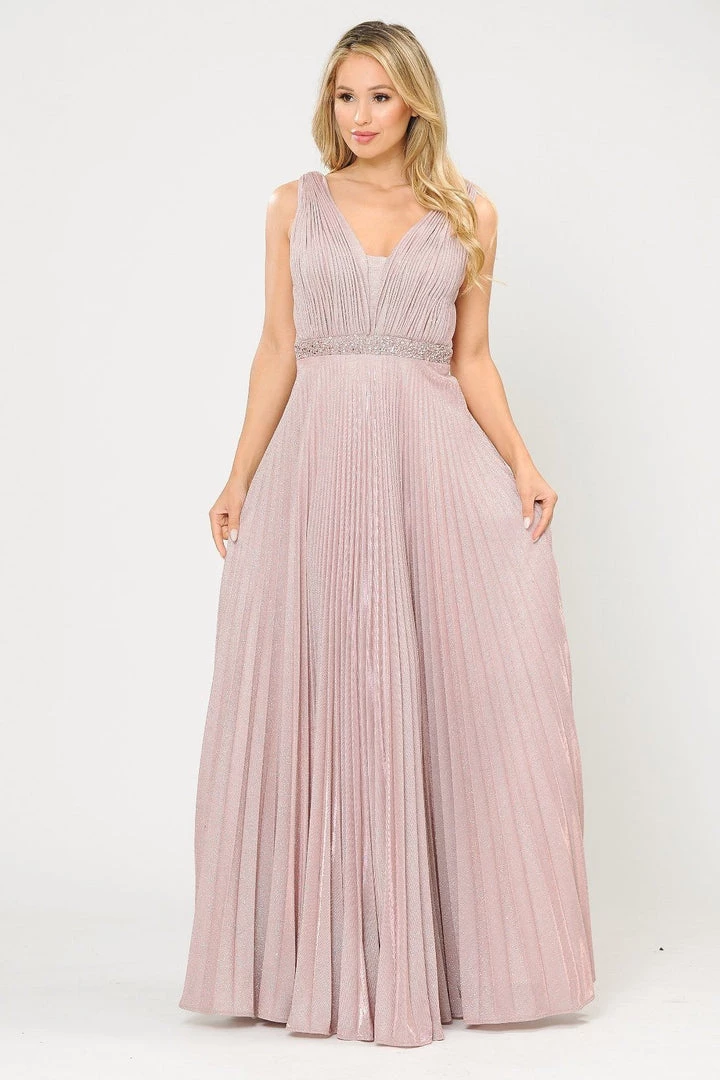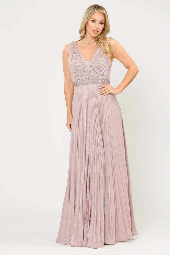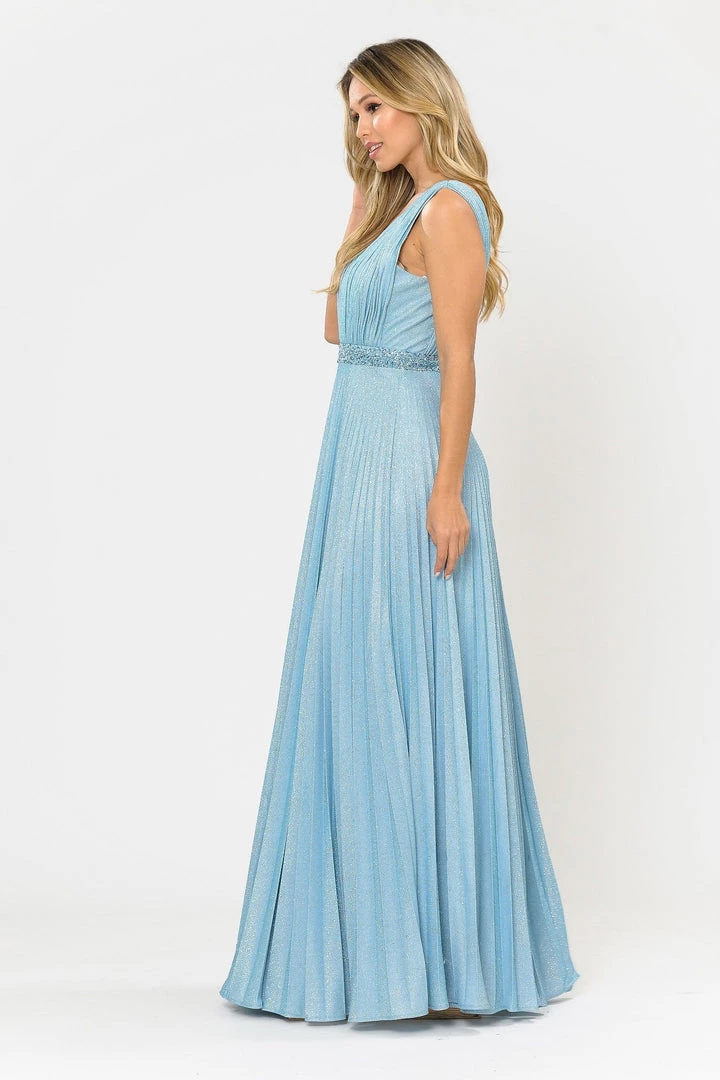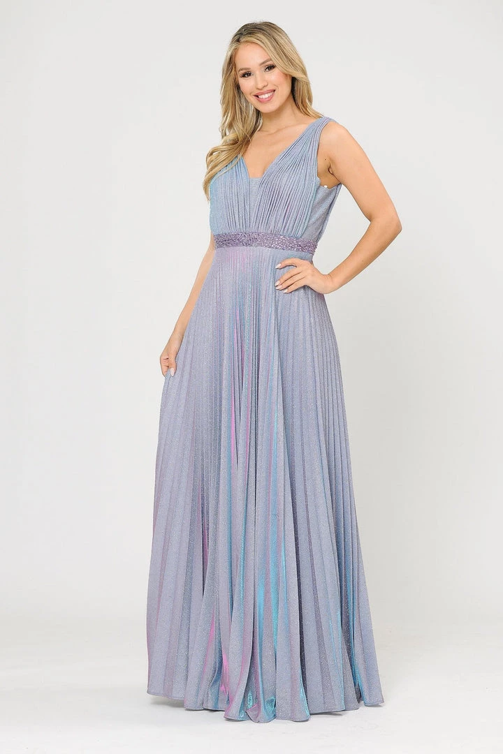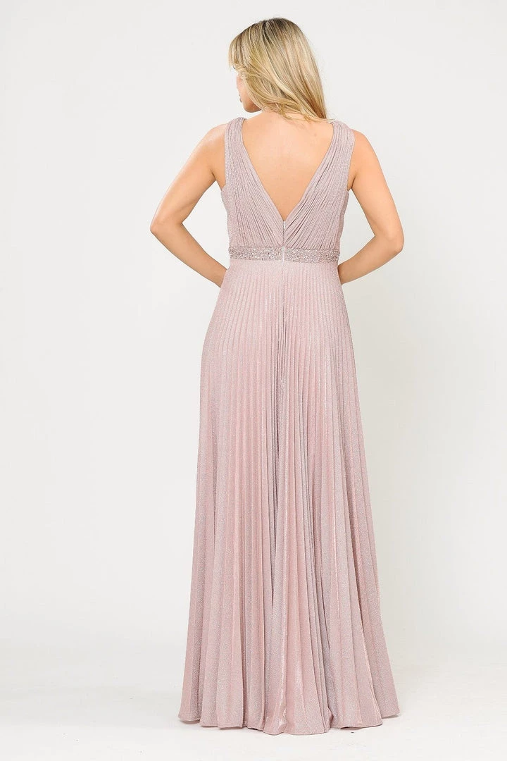Sparkle under the stars in this long A-line metallic glitter dress with open back by Poly USA 8600. This beautiful formal gown features a ruched sleeveless V-neck bodice secured with wide straps and inset panel, open V-back, floor length A-line skirt, and a zipper closure. Affordably priced under $350, this long evening dress is perfect for any formal event and will keep you on budget!