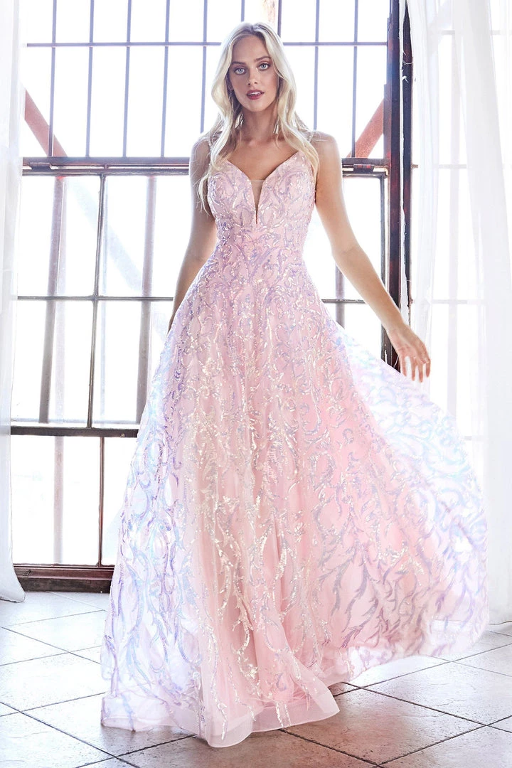 Be selfie ready in this long sleeveless sequin print dress with A-line skirt by Cinderella Divine CB055.