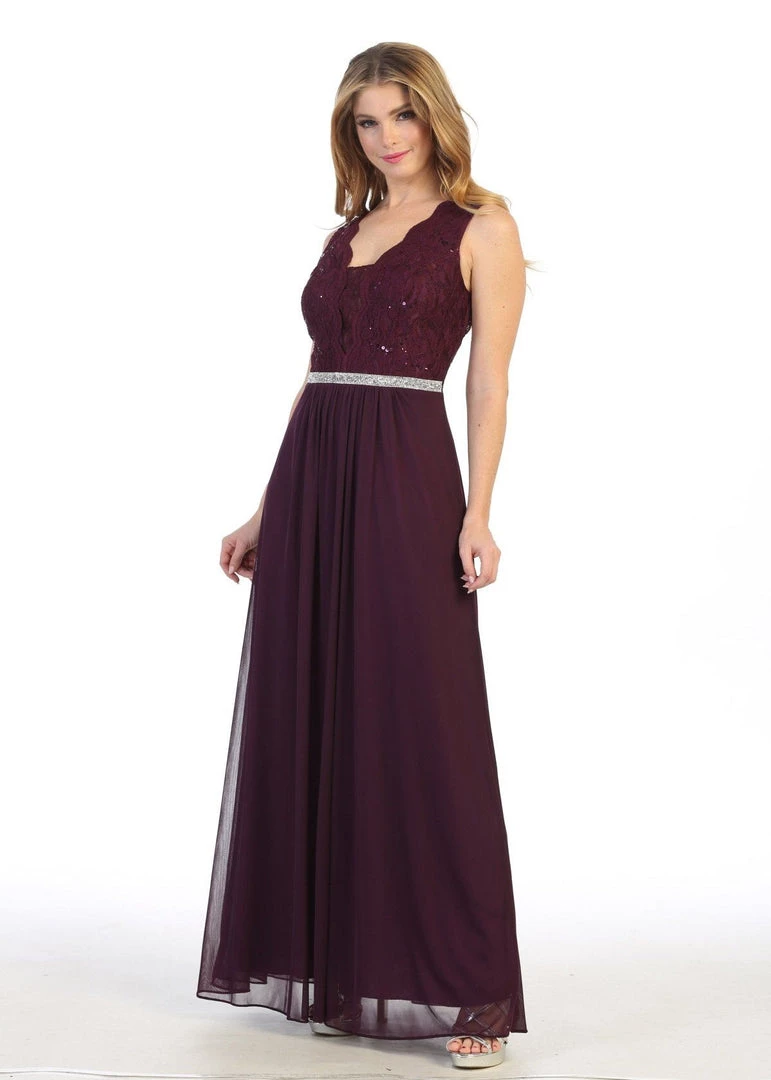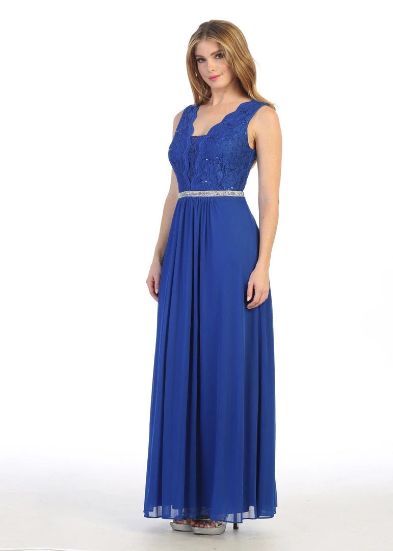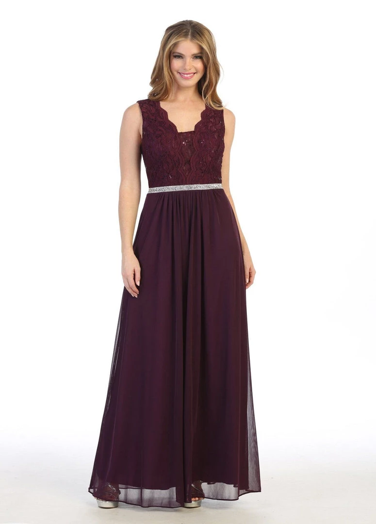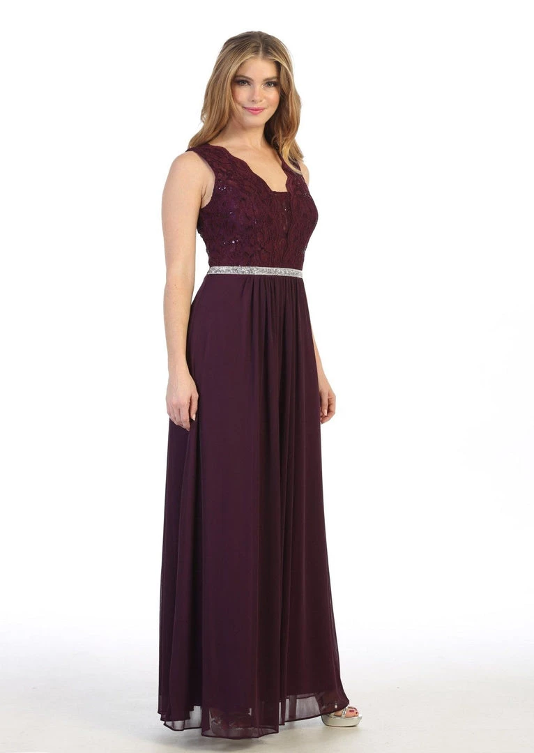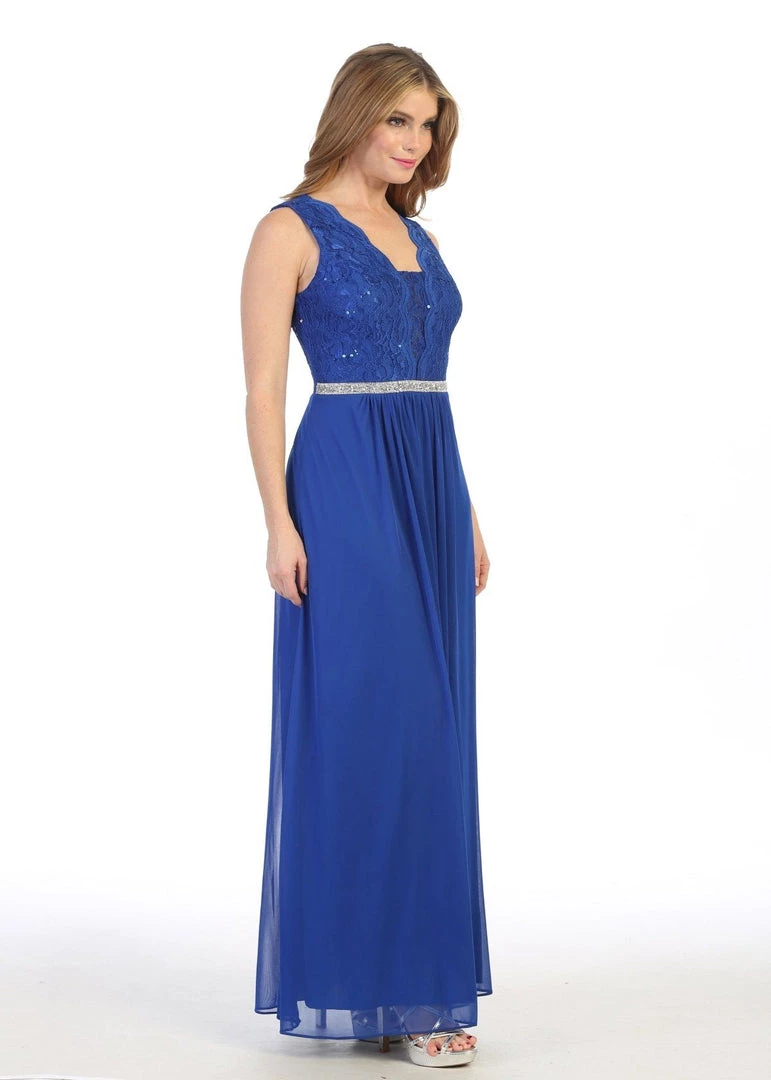 Dance the night away in this long sleeveless dress with lace bodice by Celavie 6467L. This beautiful gown features a V-neck sleeveless lace bodice, a sparkly beaded waistband, enclosed lace back, long floor length A-line chiffon skirt, and a zipper closure. Affordably priced below $140, this long evening dress is perfect for any formal event and will keep you on budget!