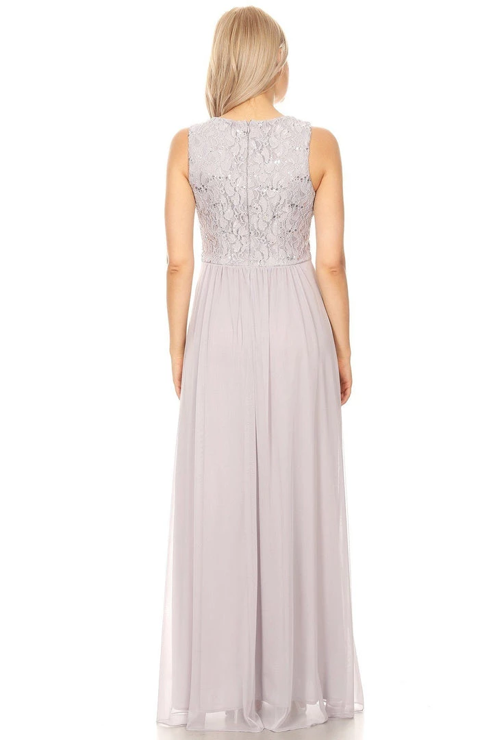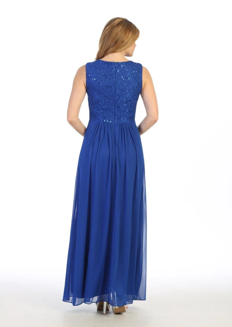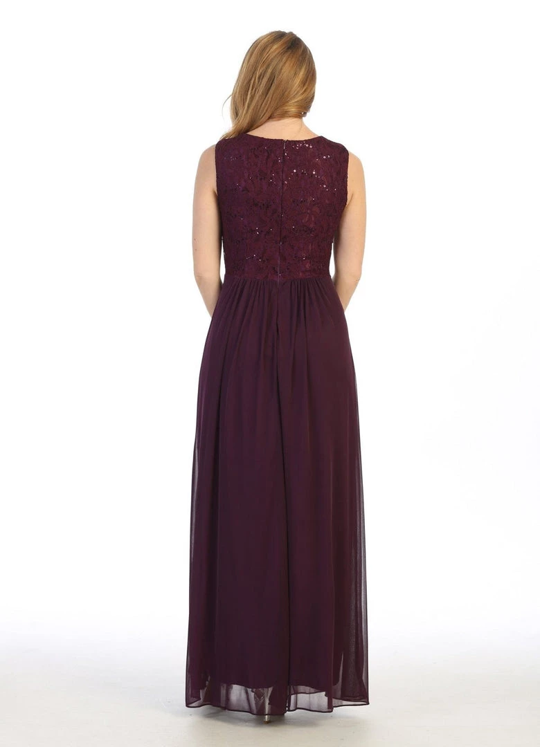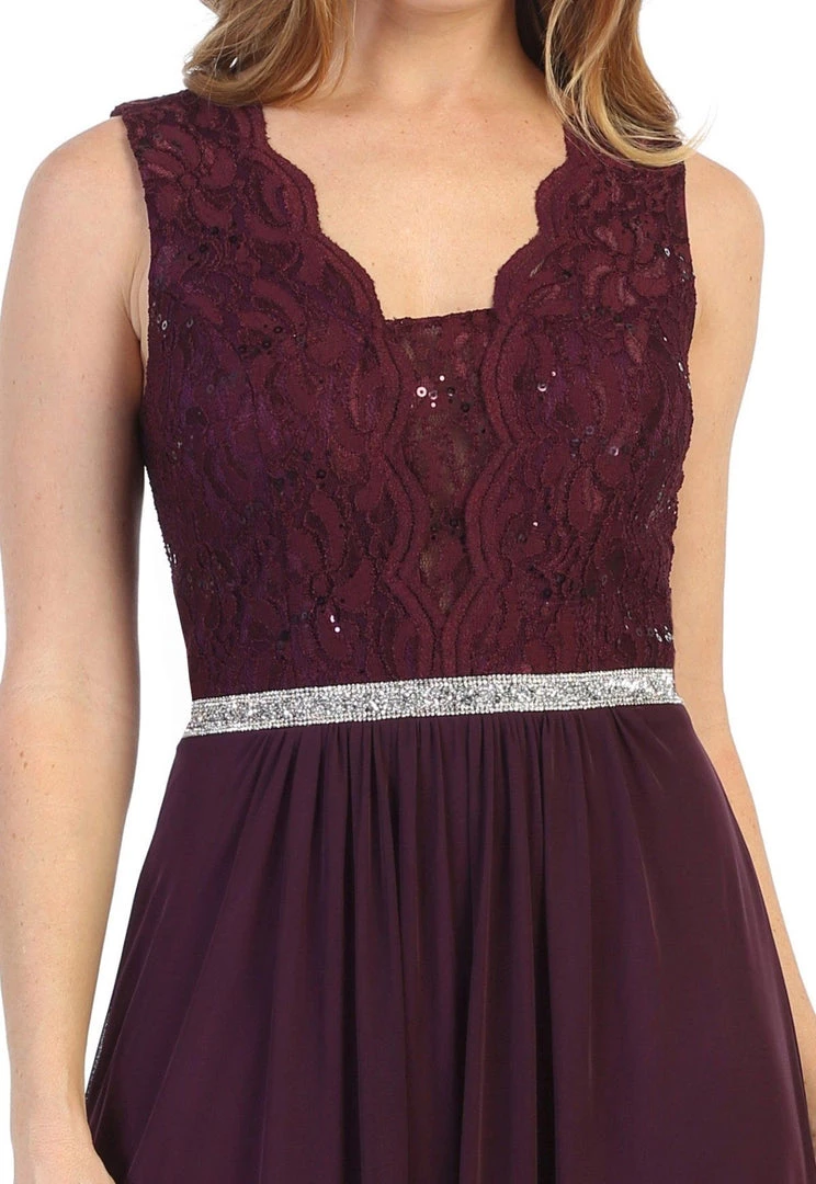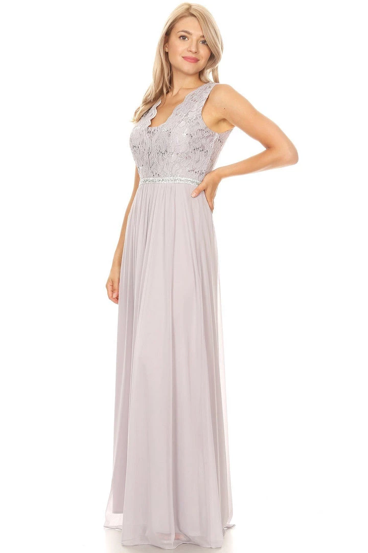 Dance the night away in this long sleeveless dress with lace bodice by Celavie 6467L. This beautiful gown features a V-neck sleeveless lace bodice, a sparkly beaded waistband, enclosed lace back, long floor length A-line chiffon skirt, and a zipper closure. Affordably priced below $140, this long evening dress is perfect for any formal event and will keep you on budget!