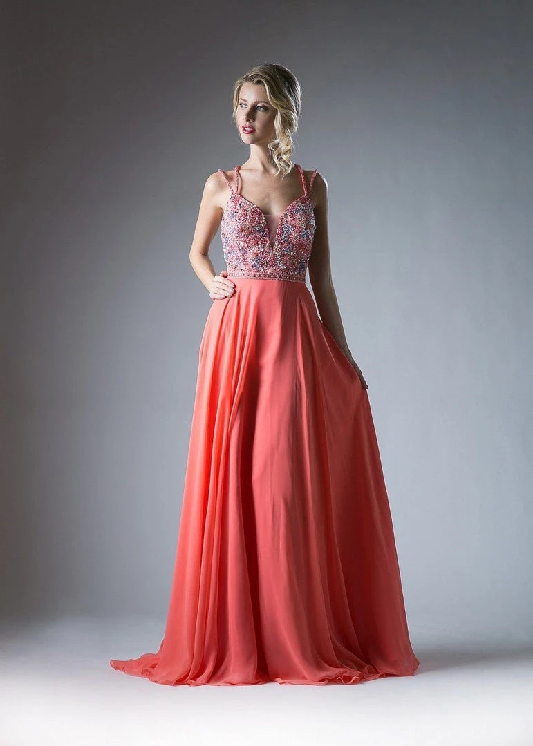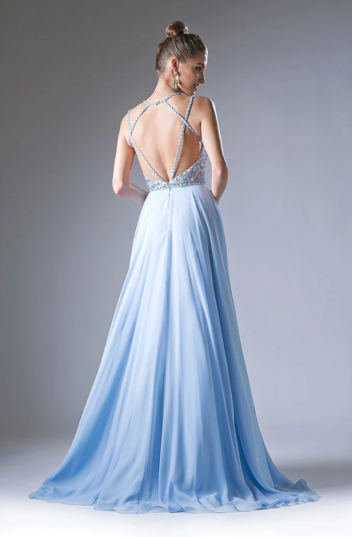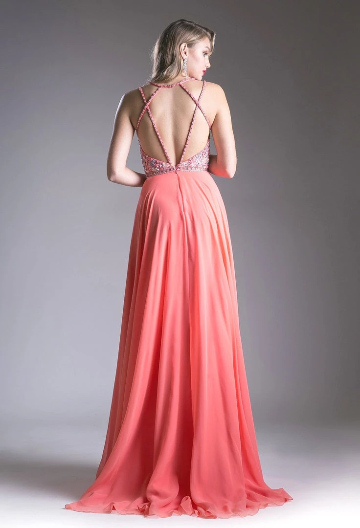 Captivate the room in this beaded long strappy back dress with A-line skirt by Cinderella Divine CR775.