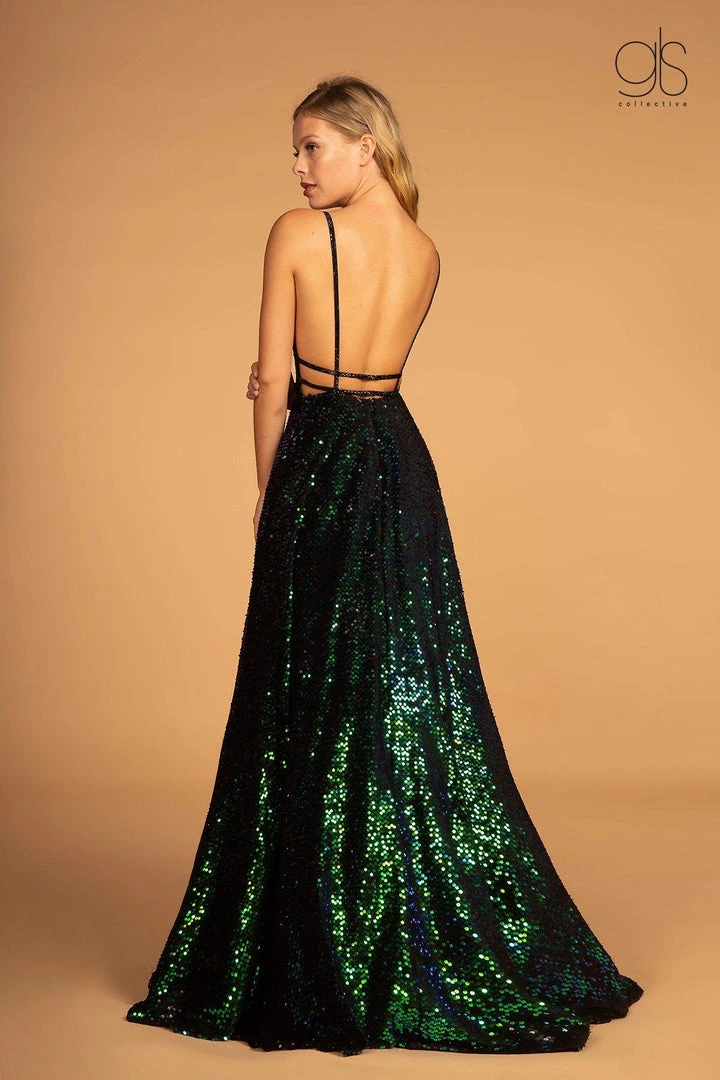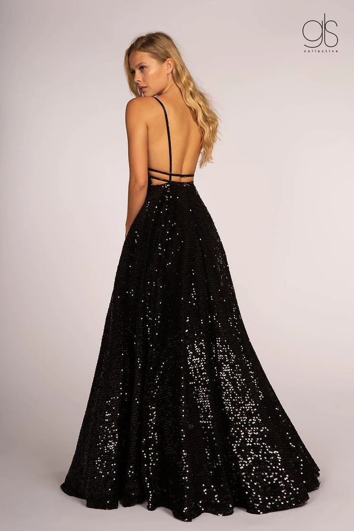 Dazzle the room in this allover sequin long a-line dress with open back by Elizabeth K GL2581.