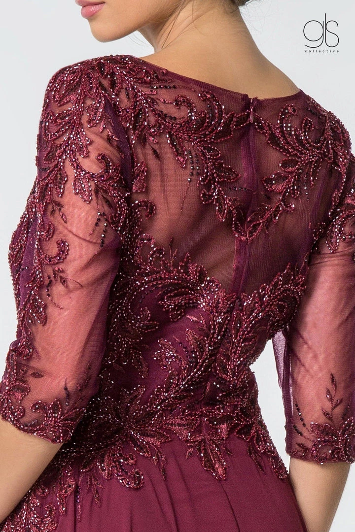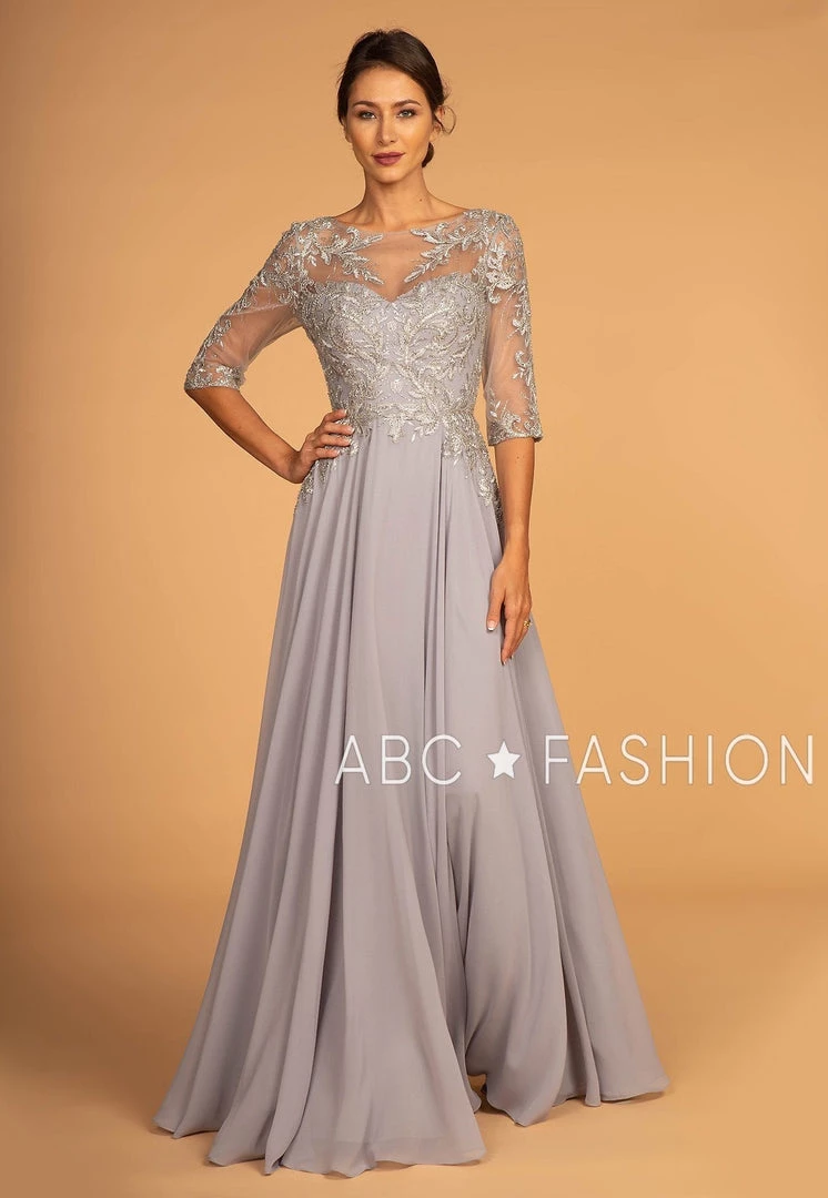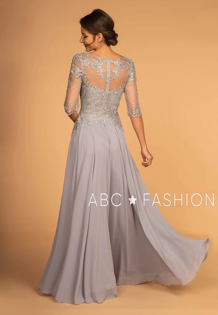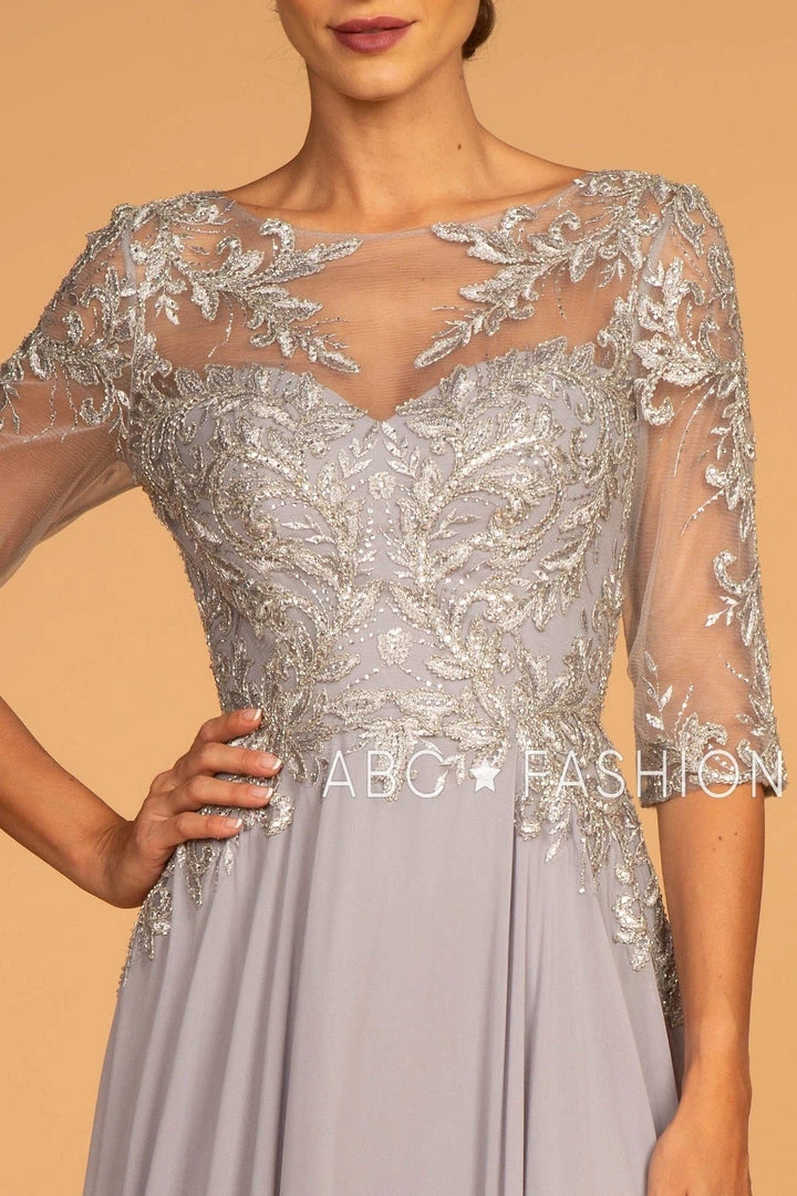 Captivate the room in this embroidered applique gown with 1/2 elbow sleeves by Elizabeth K GL2524. This long evening dress features an illusion sweetheart bodice adorned with beautiful beaded appliques that cascades past the waistline, embellished sheer half sleeves, a floor length A-line chiffon skirt, and a zipper closure. Affordably priced at $280, this dress is perfect for any formal event and will keep you on budget!