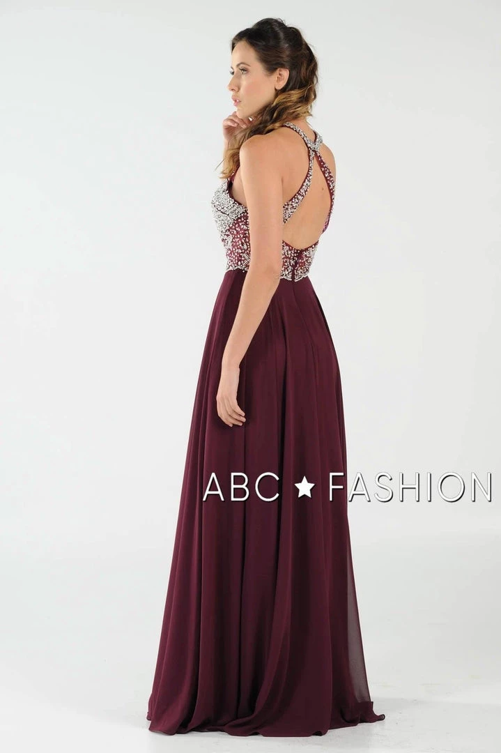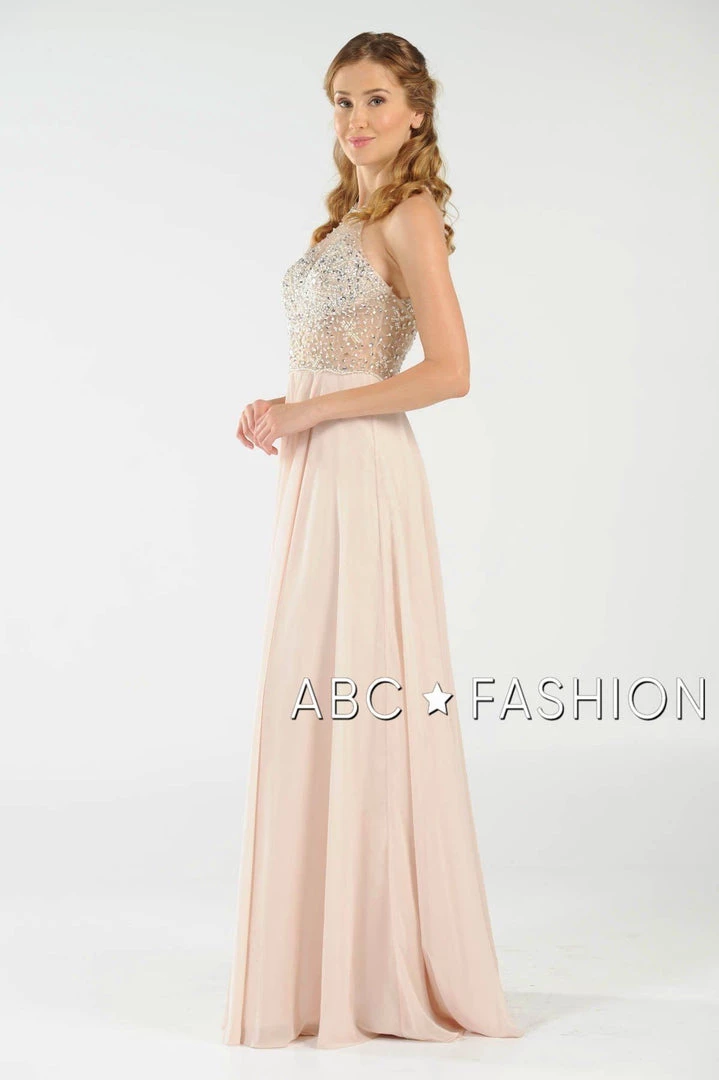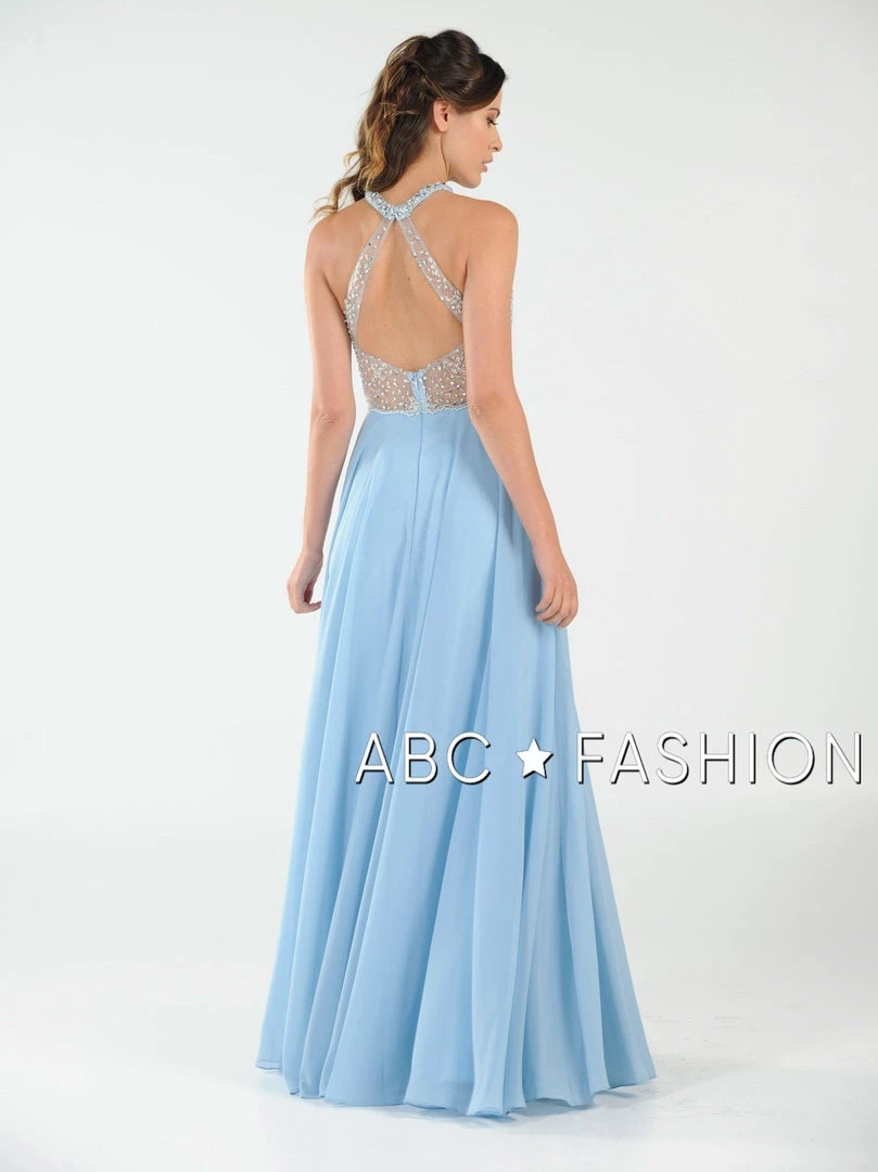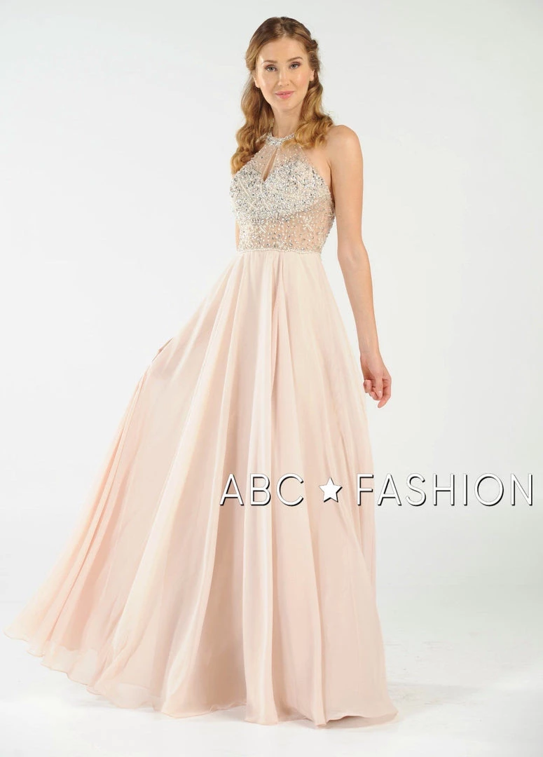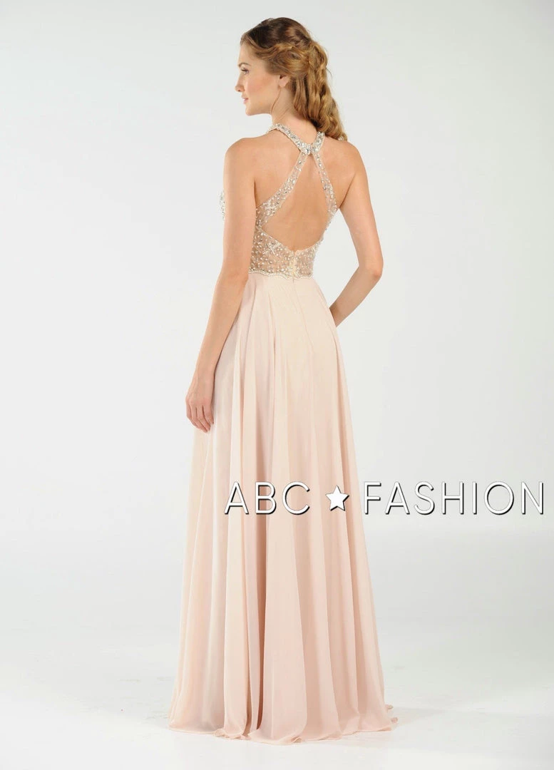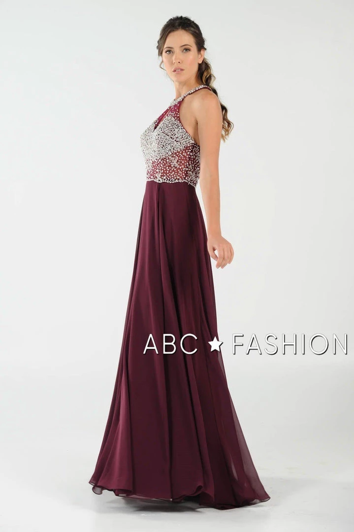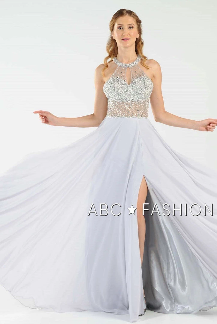 Stand out from the crowd in this sheer halter gown with beaded keyhole bodice by Poly USA 8202. Chiffon flowing long dress with mesh beaded top and sexy illusion waistline. Halter neckline with keyhole cutout, floor length A-line skirt with side slit, and a zipper closure complete even more this beautiful evening gown. Affordably priced under $270, this dress is perfect for any formal event and will keep you on budget!