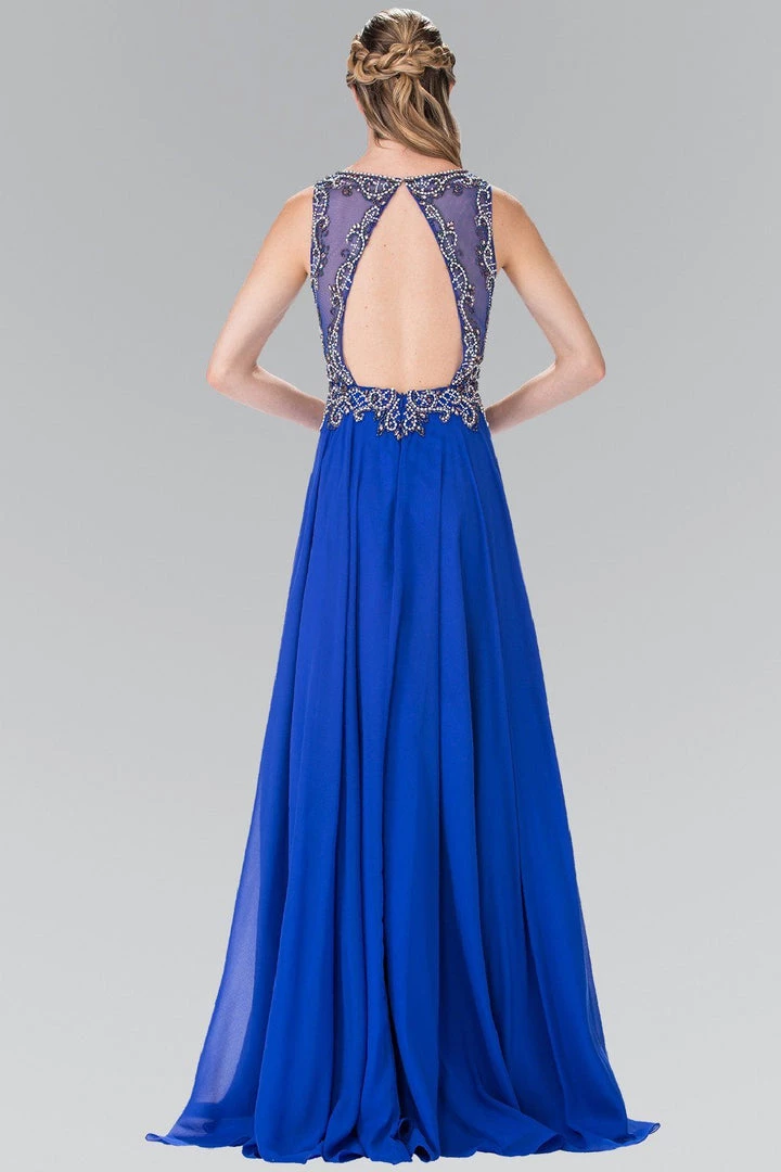 Make a grand entrance in this long beaded sleeveless chiffon dress with open back by Elizabeth K. Made out of chiffon, this beautiful gown features a lovely beaded design, a sheer neckline, and a flirty open back.