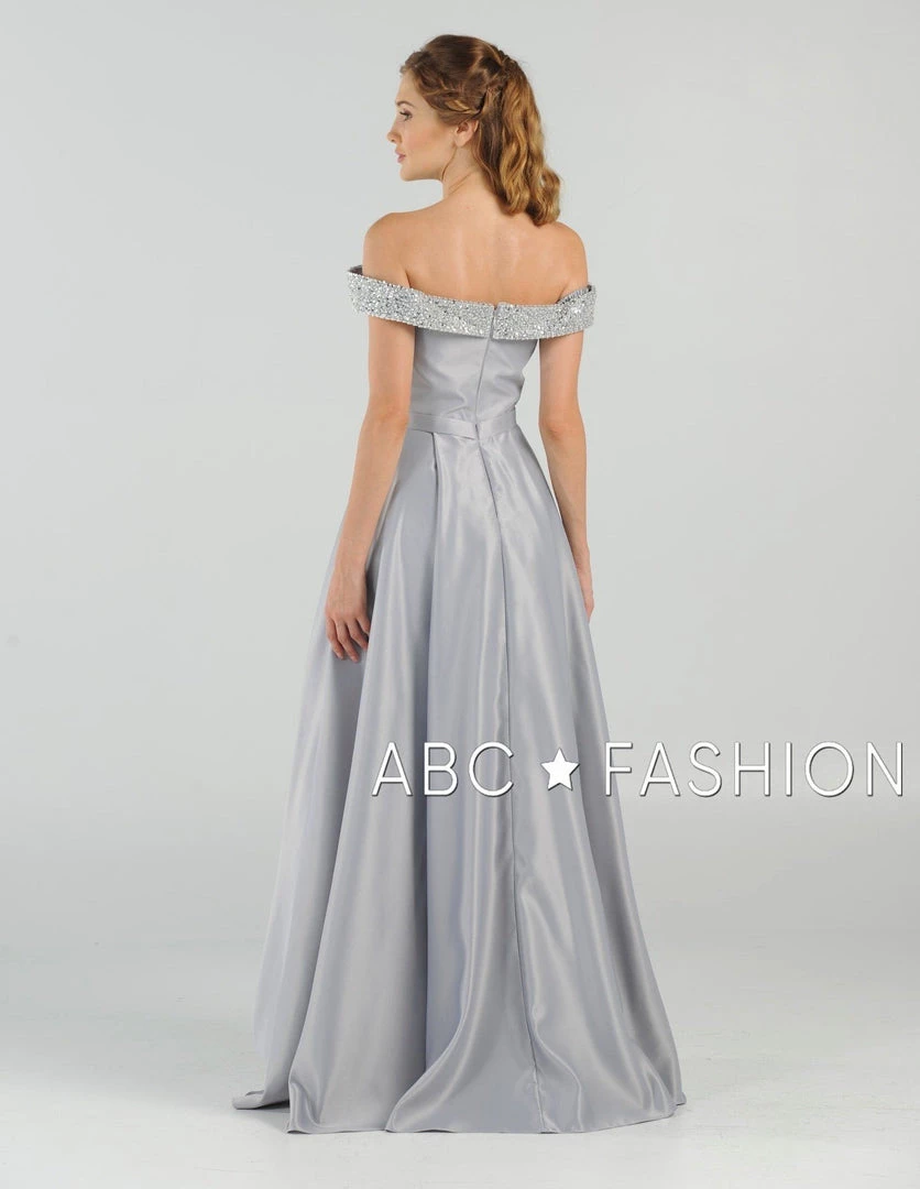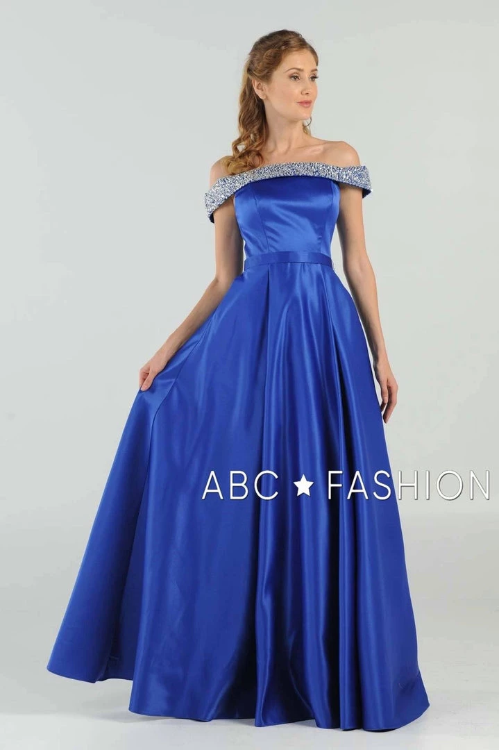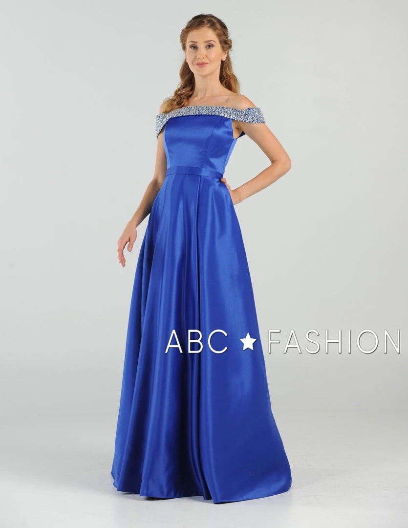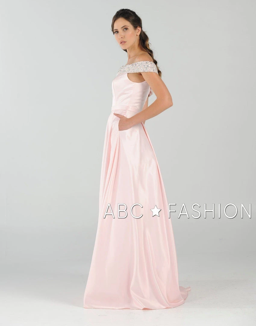 Captivate the room in this beaded off the shoulder ball gown with side pockets by Poly USA 8242. Gorgeous off the shoulder satin dress adorned with dazzling rhinestones and sequins, floor length A-line skirt, side pockets, and a zipper closure. Affordably priced under $250, this dress is perfect for any formal event and will keep you on budget!